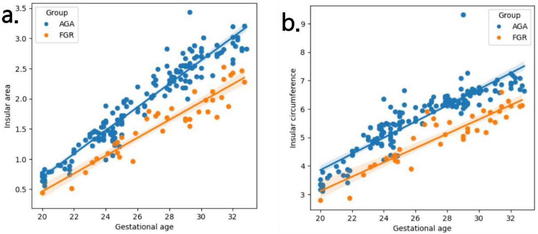 (a,b) Fitting curves of fetal insula changes with gestational age. The weekly increase in insular area of a fetus in AGA group and FGR group is 0.19 vs 0.15 (cm2), respectively. The weekly increase in insular circumference of a fetus is 0.28 vs 0.25 (cm), respectively.