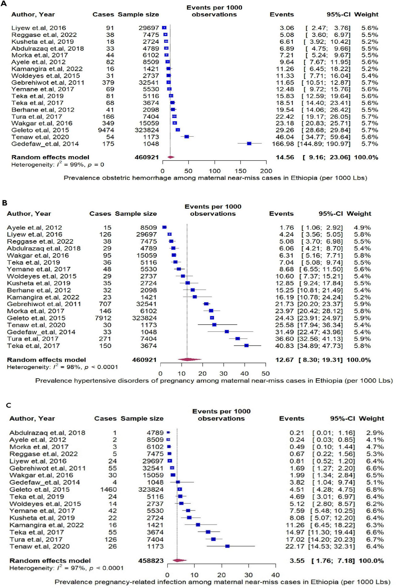 (A) The pooled prevalence of obstetrics hemorrhage per 1000 live births. (B) The pooled prevalence of by hypertensive disorder of pregnancy per 1000 live births. (C) The pooled prevalence of pregnancy related infection per 1000 live births.