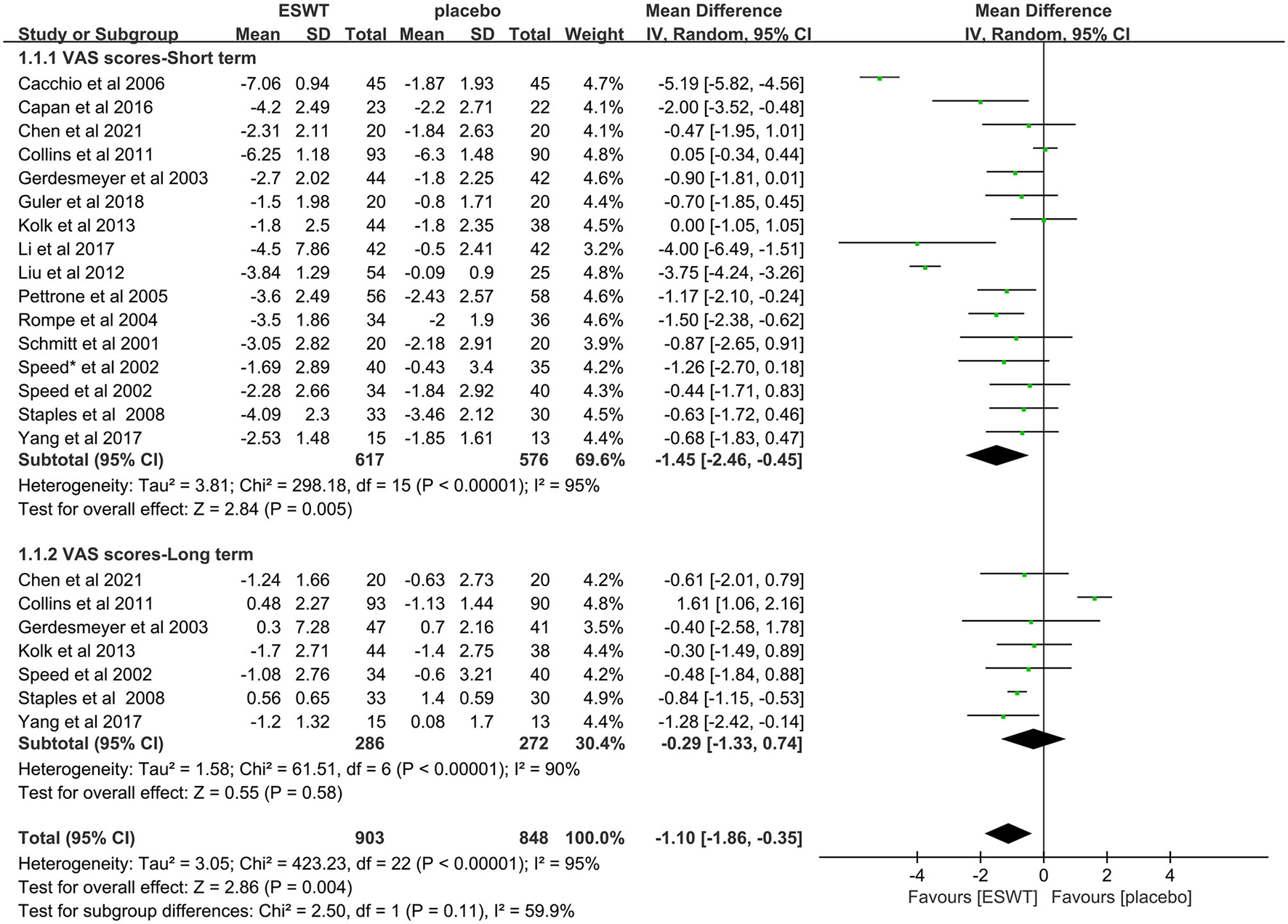 | Yang et al. (42) | China | rESWT:15 | 8/7 | 50.93 ± 8.40 | LE | 6.53 ± 6.45 | VAS | NO | 2,000 | MT | Once a week, 3 sessions |