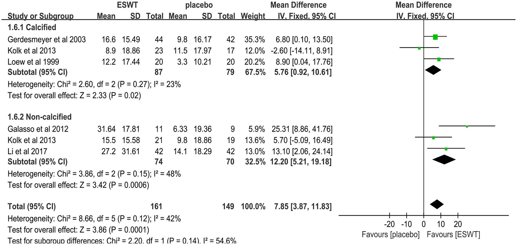 Huisstede BM Gebremariam L van der Sande R Hay EM Koes BW . Evidence for effectiveness of Extracorporal Shock-Wave Therapy (ESWT) to treat calcific and non-calcific rotator cuff tendinosis–a systematic review. Manual ther. (2011) 16:419–33. 10.1016/j.math.2011.02.005