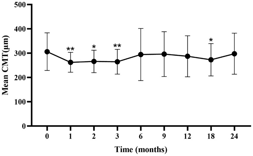 The mean CMT significantly decreased from baseline during the first 3 months (p < 0.05; Figure 2; Supplementary Table S2). A slight increase in CMT was observed from 6 to 24 months, with no significant difference from baseline at 6 months.