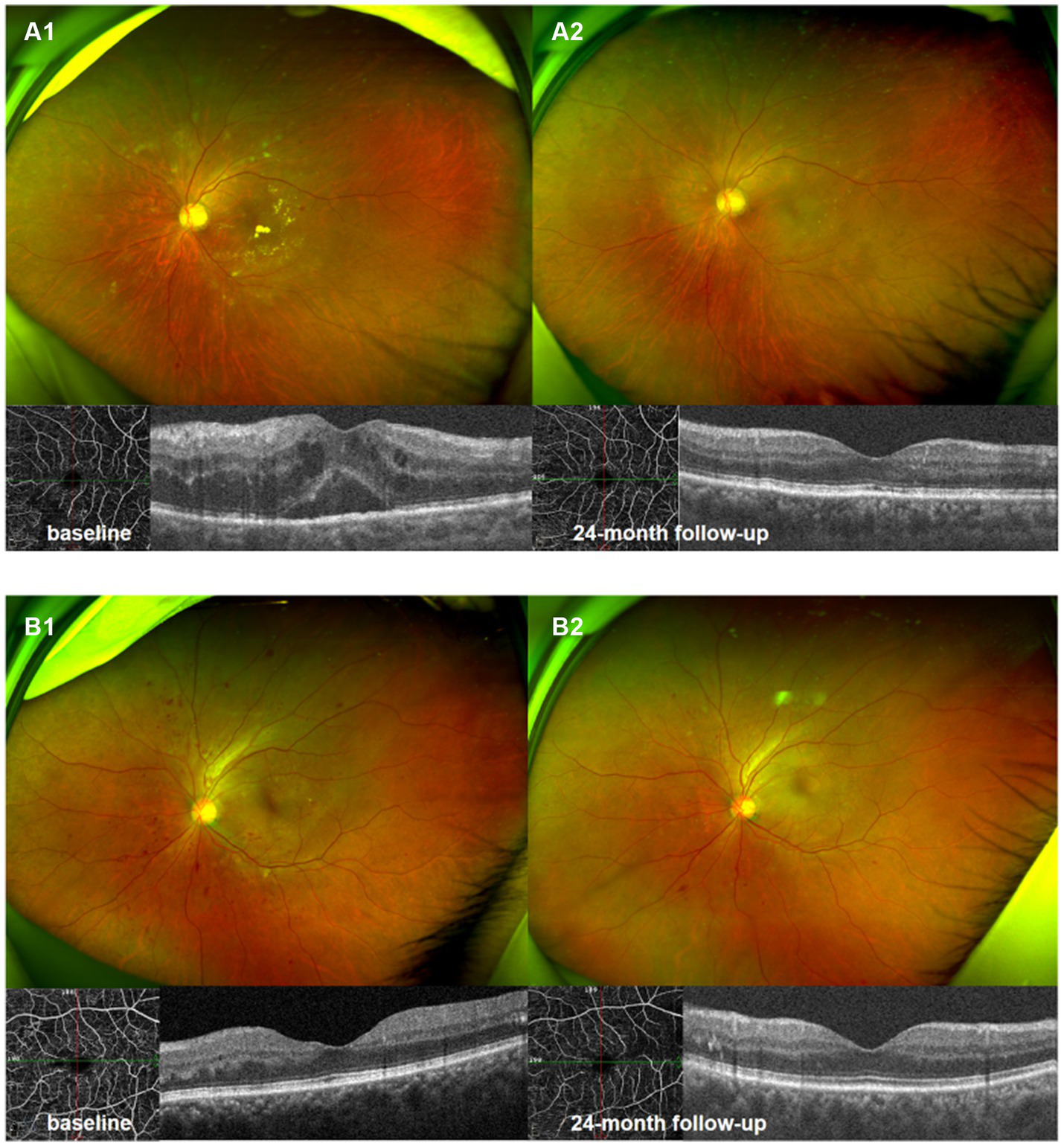 Ultrawide-field fundus photography and optical coherence tomography 6 × 6 mm scan of NPDR eye accompanied with DME (A1,A2), and NPDR eye without DME (B1,B2). Compared with baseline (A1,B1), there were significant improvement in DRSS scores, decrease in hemorrhagic and hard exudates area in 24th month following (A2,B2).