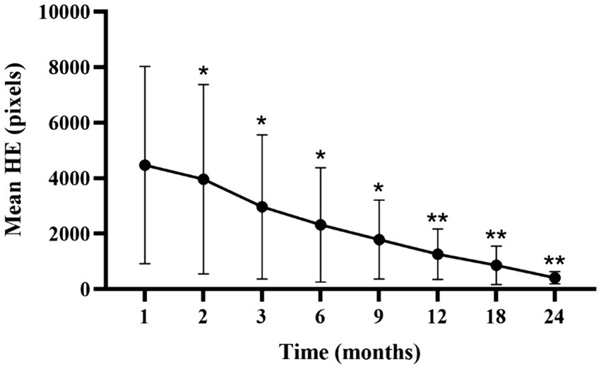 Mean ± standard deviation HE area from 1-month to 24-month follow-up time points. *p < 0.05 vs. baseline; **p < 0.001 vs. baseline. HE, hard exudate.