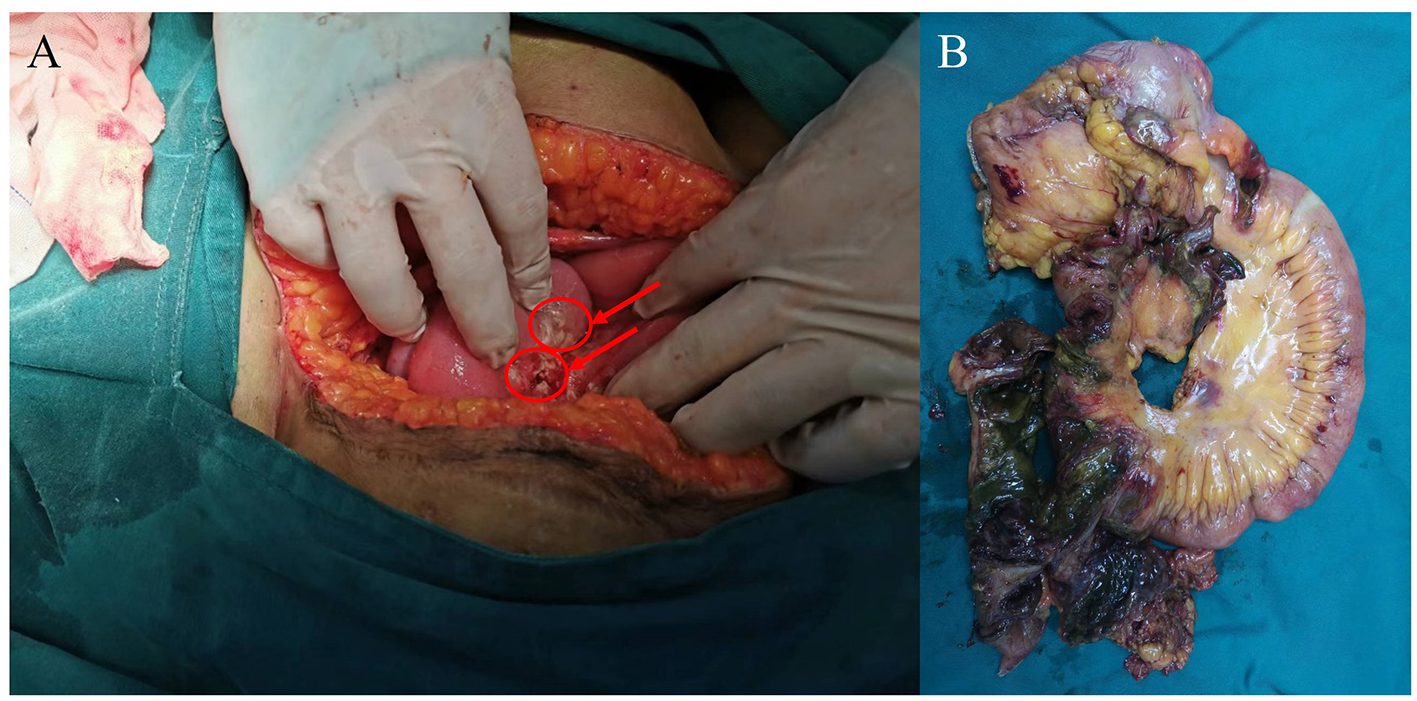 Photograph taken during surgery. (A) The right hemicolectomy (red arrowhead), surrounded by inflammatory thickened tissue. (B) Multiple perforations and necrosis of part of the ileum and right companion colon.