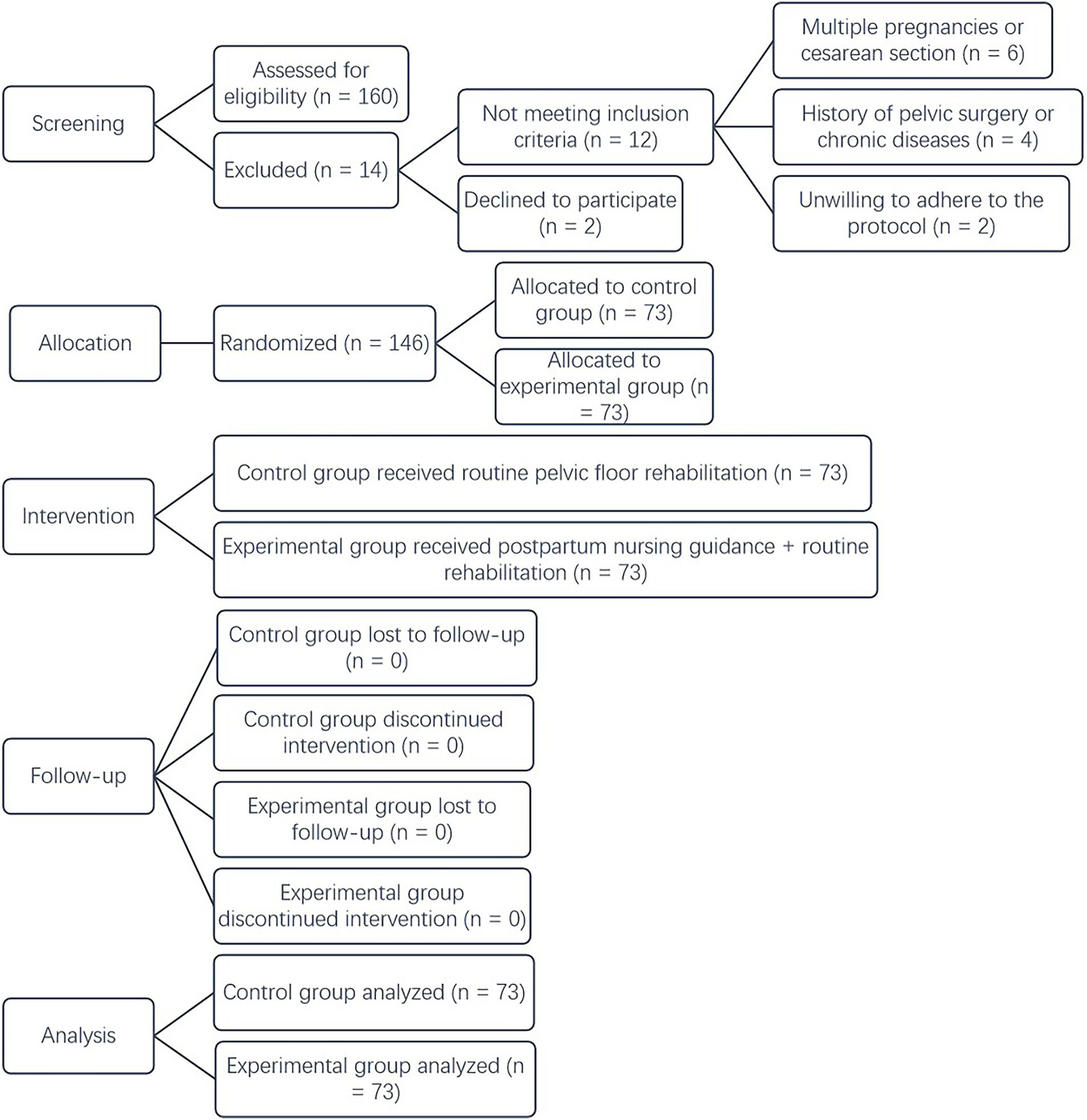 The sample size was determined by a power analysis using G*Power software (v.3.1.9.7). This study assumed a medium effect size of 0.5 for the main outcome of PFM strength. The power was set at 0.8, and the significance level was set at 0.05, which resulted in 64 participants per group. The sample size was increased to 73 participants per group to account for possible dropouts and missing data. All data in this study were statistically analyzed using SPSS 22.0 statistical software. The measurement data were expressed as mean ± standard deviation, and a t-test was conducted between the groups. Count data were expressed as rates, and a chi-squared (χ2) test was performed between the groups; p < 0.05 was considered statistically significant.