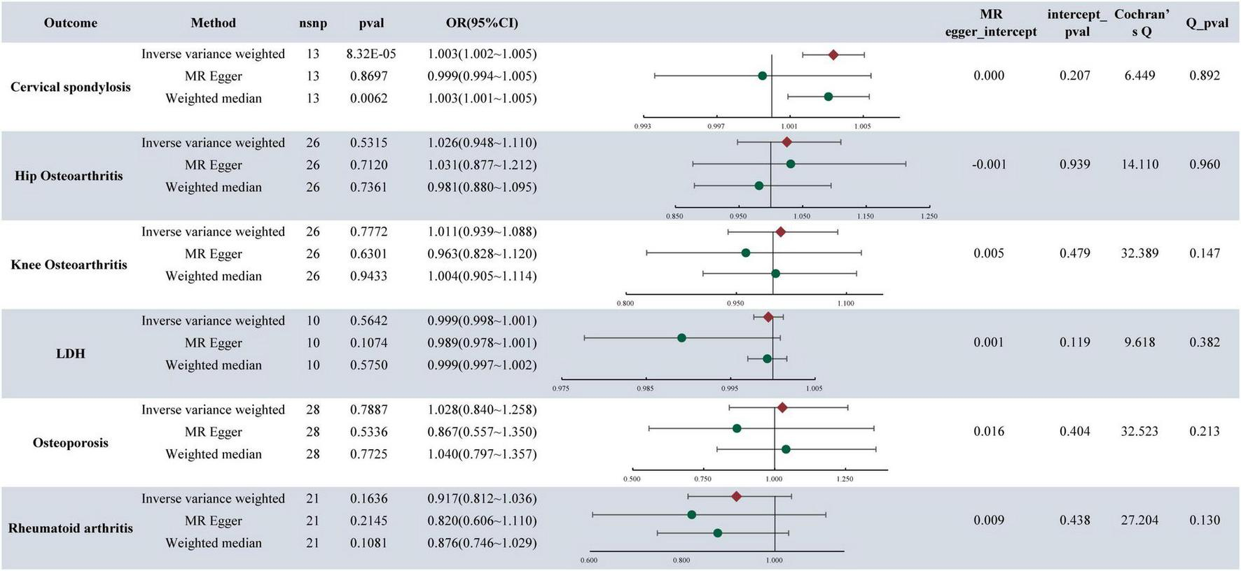 MR analysis and sensitivity analysis results of major depressive disorder and six musculoskeletal diseases.