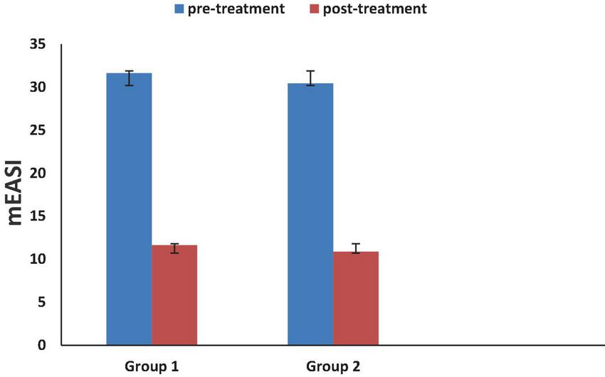 Baseline mEASI score, both groups were 31.64 ± 6.465 and 30.44 ± 8.409 (Mean ± SD) indicating that all patients were at severe grade according to Hanifin et al. (24).