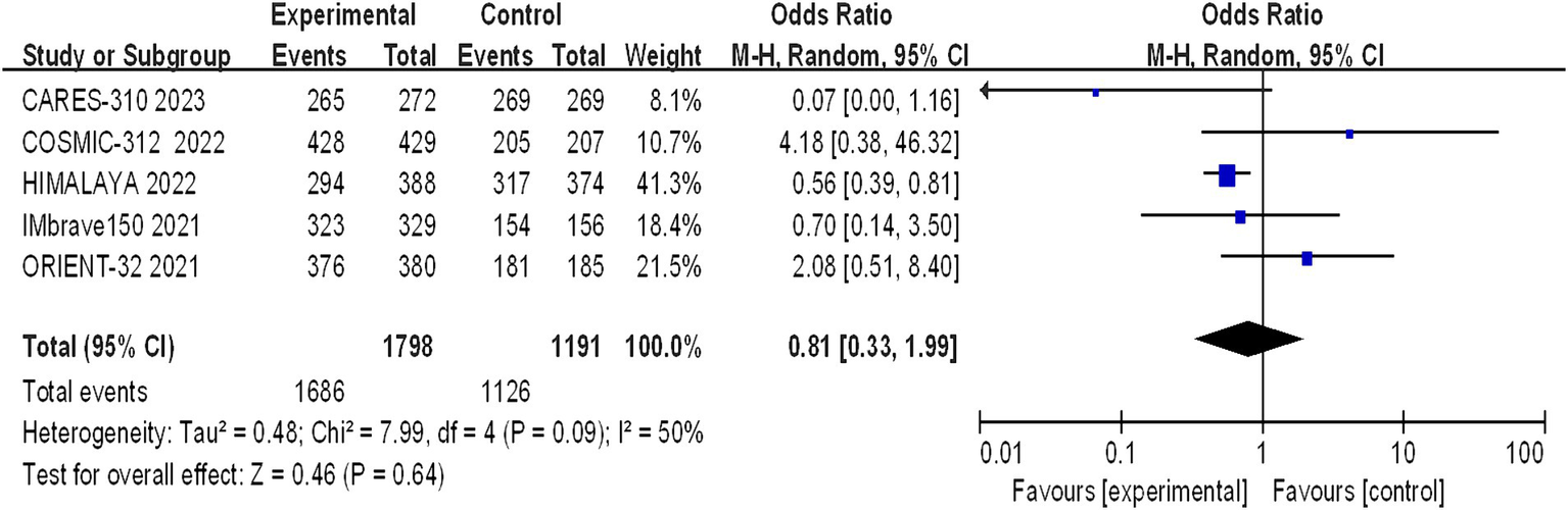 The incidence of arbitrary-grade AEs were documented in 5 papers, and the assessment of heterogeneity revealed significant variability across studies (I2 = 50%, p = 0.09), prompting the utilization of a random effects model for analysis. The rates of adverse events in the immunotherapy combination group and the sorafenib group were 93.72% and 94.54%, respectively. The meta-analysis revealed no statistically significant difference in the overall incidence of AEs between the experimental and control groups (OR = 0.81, 95% CI: 0.33–1.99, p = 0.64) (Figure 7).