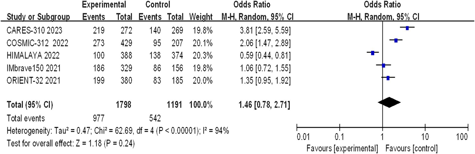 A total of 5 RCTs were included. The results of the meta-analysis showed the following: (1) Effectiveness. Compared to sorafenib, combination immunotherapy significantly improved overall survival (OS, HR = 0.69, 95% CI: 0.58 ~ 0.82, p < 0.01) and progression-free survival (PFS, HR = 0.62, 95% CI: 0.50 ~ 0.78, p < 0.001) in patients with advanced HCC. (2) Safety. Both groups had comparatively high incidences of adverse events (AEs), but the difference in any treatment-related adverse events was not significant between the two arms (OR = 0.98, 95% CI: 0.95 ~ 1.02, p = 0.34). The difference in the incidence of grade 1–2 adverse reactions was statistically significant (OR = 0.66, 95% CI = 0.49–0.90, p = 0.001). There were no differences in grade 3/4 TRAEs or grade 5 TRAEs (OR = 1.46, 95% CI = 0.78 ~ 2.71, p = 0.24; OR = 1.08, 95% CI = 0.73 ~ 1.58, p = 0.71).
