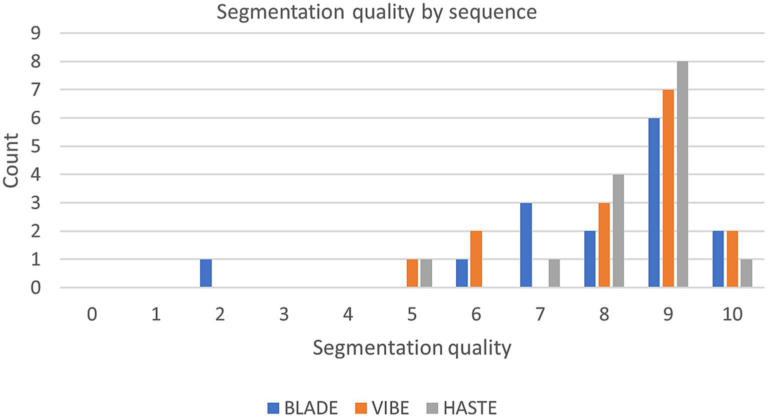 The latest implementation of the 2D nnU-Net (Version 2) was utilized in its default configuration. It is a self-configuring framework, which automatically adapts its architecture, pre-processing, and training pipeline to a given dataset. The nnU-Net framework employs a U-Net-based architecture comprising an encoder-decoder structure. On the encoder path, the spatial dimensions of the input image are successively reduced through convolutional layers and max-pooling, thereby capturing increasingly abstract feature representations. On the decoder path, upsampling is applied to restore the spatial dimensions, concatenating feature maps from the corresponding encoder layers. This allows for high-level semantic information and precise localization. For further details to the nnU-Net, please refer to (22). Three individual nnU-Net configurations were trained, one for each sequence using the following steps: based on the 55 study cases per sequence, the data were partitioned into 58% as training set, 14% as validation set, and 27% as test set. This resulted in 32 cases being used for training, eight cases for validation and 15 cases for testing per sequence. The training and validation sets were utilized for the initial and fine-tuning training of the neural network, while the test set was withheld for final evaluation. To ensure an average performance, we validated the models utilizing 5-fold cross-validation with different training and validation set partitions as per default nnU-Net configuration. All calculations were performed on two Tesla V100S PCIe 32GB with 1,000 epochs and an average run time of 33 h per fold. The batch size was subject to variation during the training phase, with values of 14, 32, and 33, respectively, being applied to BLADE, VIBE, and HASTE. Stochastic gradient descent was employed for optimization purposes, with a weight decay of 3e−5 and an initial learning rate of 0.01. Z-score normalization was utilized as the normalization method. For inference and producing the final predictions the nnU-Net uses an ensemble of all five folds, reporting one final result for the test set. For external validation a separate dataset was utilized. This external dataset was chosen to simulate real-world scenarios and challenges, ensuring a comprehensive examination of the model’s performance across diverse imaging conditions.