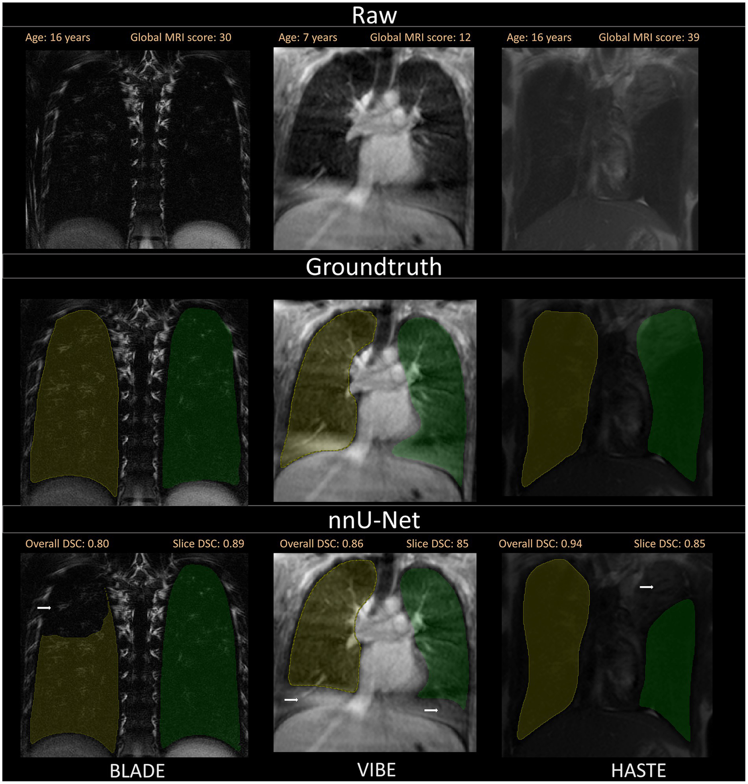 The results demonstrated a high level of segmentation performance across all sequences, with only minor differences observed in the mean Dice coefficient: BLADE (0.96 ± 0.05), VIBE (0.96 ± 0.04), and HASTE (0.95 ± 0.05). Additionally, the segmentation quality was consistent across different disease severities, patient ages, and sizes. Manual evaluation identified specific challenges, such as incomplete segmentations near the diaphragm and dorsal regions. Validation on a separate, external dataset of nine toddlers (2–24 months) demonstrated generalizability of the trained model achieving a Dice coefficient of 0.85 ± 0.03.