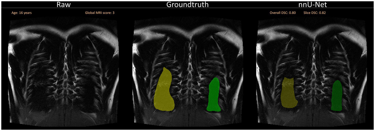 Notably, Astley et al. tested 2D and 3D nnU-Nets for lung segmentation of patients with varying pulmonary pathologies. In their patient cohort (median age 34 yrs.), analysis of a dataset comprising 809 spoiled-gradient-recalled and UTE MRI scans, even across different vendors, demonstrated a remarkable performance, reaching a median Dice coefficient of 0.96 internally and 0.97 on an external test set (30). To enhance the accuracy of automated lung segmentation, by inclusion of artificially generated images with consolidations, Cristoso et al. reached a Dice coefficient of 0.94 on a cohort of healthy volunteers and patients (31). In a 2023 study of neonates, either healthy or suffering from bronchopulmonary dysplasia, the authors employed CNNs for lung segmentation on quiet-breathing MRI and achieved a Dice coefficient of 0.908 on an internal test set and 0.88 on an independent test set (32). Most recently, a new approach for lung segmentation on healthy adults using thresholding and clustering on an enhanced deep-inspiration-breath-hold reached a Dice coefficient of 0.94 (33, 34). A high benchmark for lung lobe segmentation using pseudo-MRI images derived from CT and three concatenated CNNs achieved a Dice coefficient of 0.95 on a dataset of 100 CF patients over the age of 4.7 years old (35).
