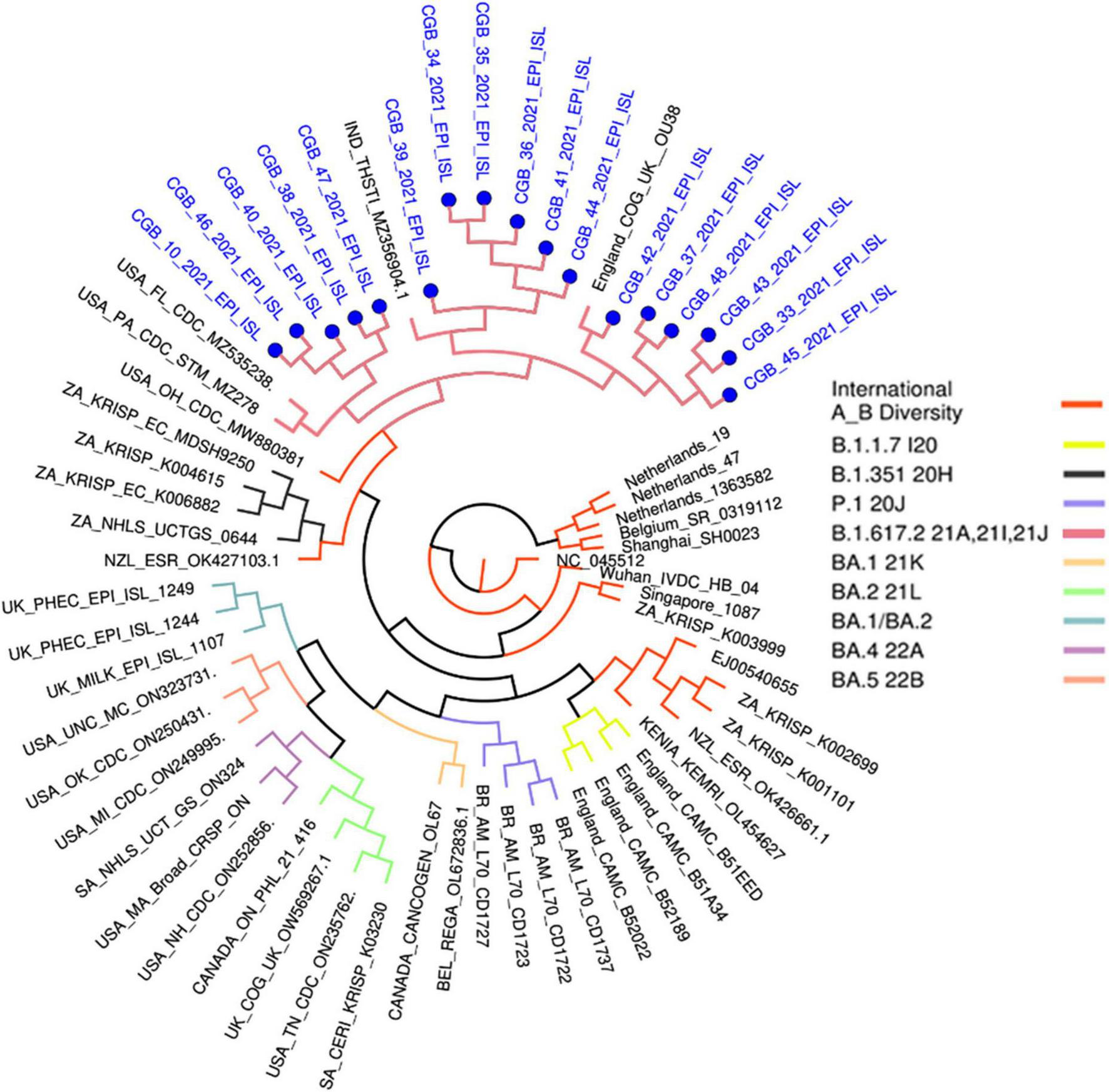 *B.1.1.7 I20 belongs to the Alpha variant. B.1.351 20H belongs to the Beta variant. P.1 20J belongs to the Gamma variant. B.1.617.2 21A, 21I, 21J belong to the Delta variant. BA.1 21K, BA.2 21L, BA. 1/BA.2, BA.4 22A, and BA.5 22B belong to Omicron variant of SARS-CoV-2.