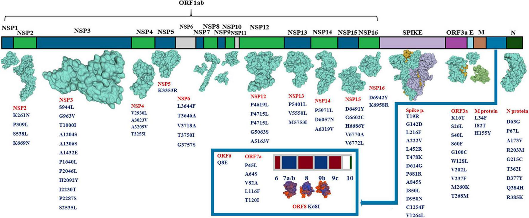 The mutations observed in this work belonged to both structural and non-structural proteins (Figure 3). Among non-structural proteins, we did not determine changes in NSP1, NSP7, NSP8, NSP9, NSP10, and NSP11. The number of mutations observed in this work coincides with proteins’ molecular parameters; the highest number of mutations were determined in NSP3 and spike protein. NSP3, the largest coronavirus protein, is one of the essential proteins involved in replication/transcription processes (20). NSP3 is one of the well-established proteases in SARS; NSP3 is responsible for papain-like functions (21) and NSP5 is known as 3CL (chymotrypsin-like main) protease (22).