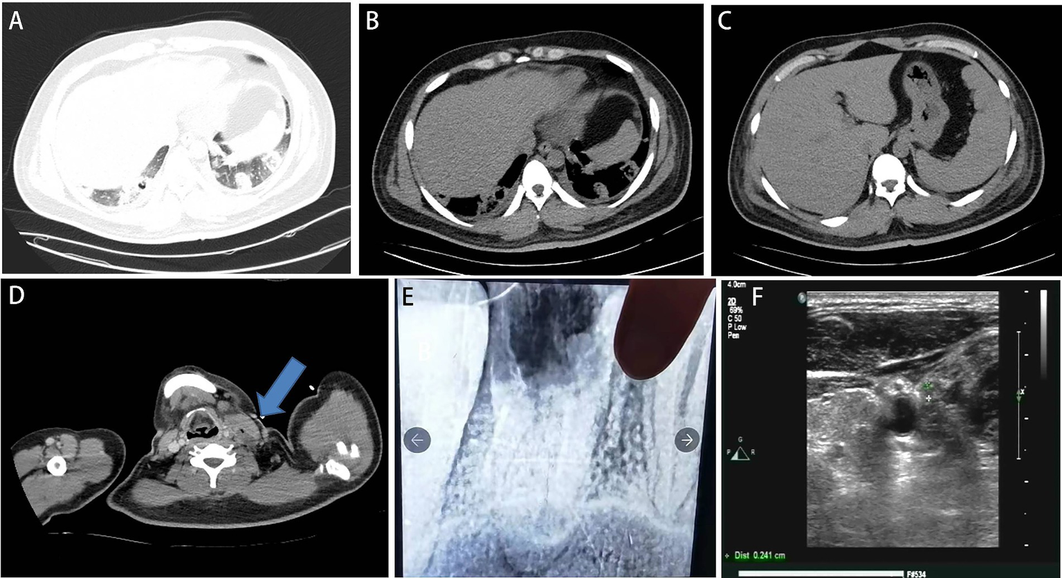 (A–D) Computed tomography scan at admission to the intensive care unit. (A,B) It showed bilateral pulmonary nodules and cavities. (C) Decreased liver density. (D) Left internal jugular vein thrombosis with gas accumulation (blue arrow). (E) X-ray after charge in a dental clinic. A cavity was at the left maxillary first premolar. (F) 2 months after discharge, the ultrasound showed that the thrombus in the neck had not subsided.