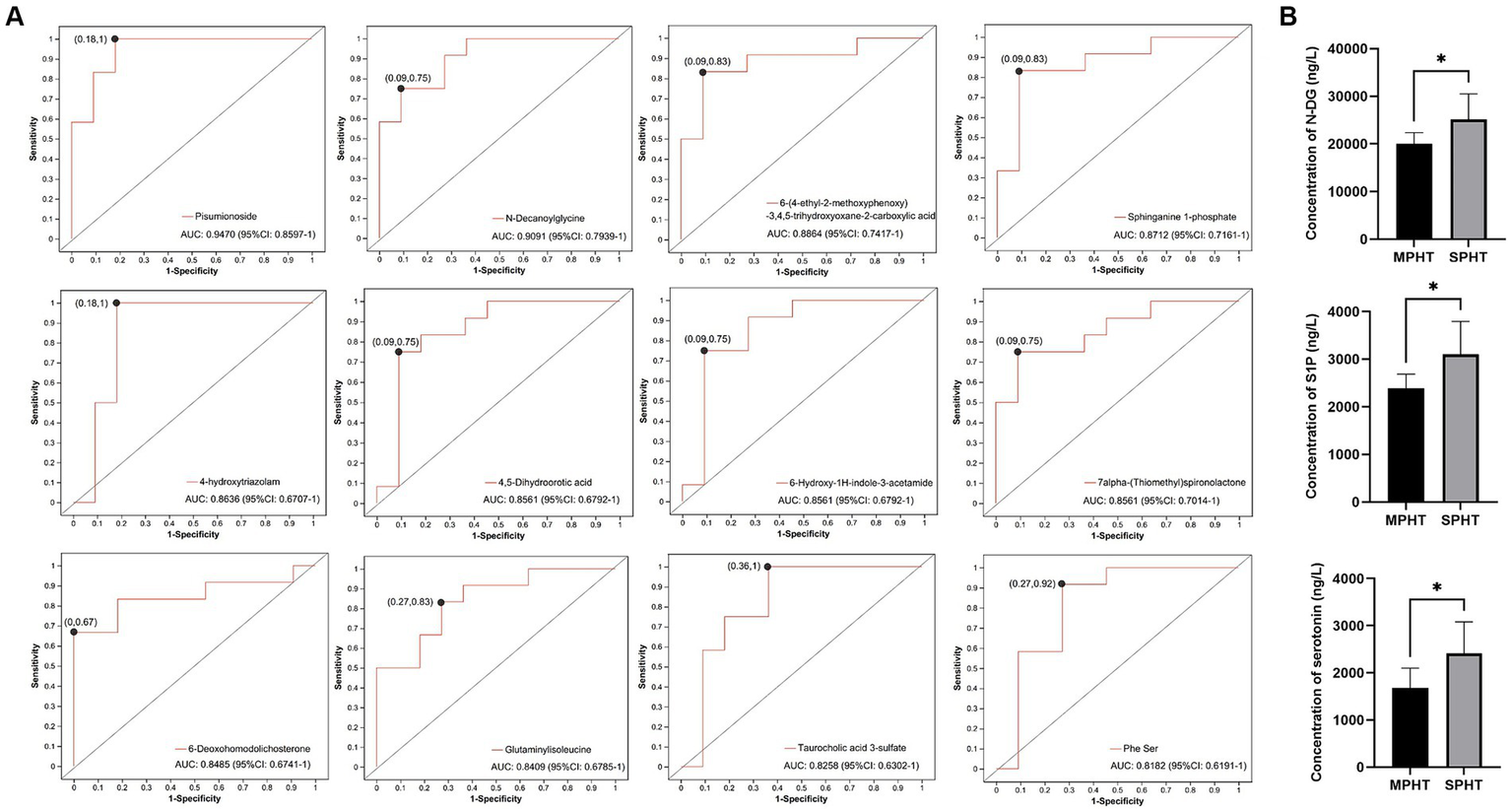 To assess the diagnostic capability of differential metabolites for SPHT, we conducted a receiver operating characteristic (ROC) curve analysis on the 15 significantly elevated differential metabolites in SPHT patients. The following differential metabolites presented area under the curve (AUC) >0.8 through ROC analysis: pisumionoside (0.947), N-DG (0.9091), 6-(4-ethyl-2-methoxyphenoxy)-3,4,5-trihydroxyoxane-2-carboxylic acid (0.8864), S1P (0.8712), 4-hydroxytriazolam (0.8636), 4,5-dihydroorotic acid (0.8561), 6-hydroxy-1H-indole-3-acetamide (0.8561), 7alpha-(thiomethyl)spironolactone (0.8561), 6-deoxohomodolichosterone (0.8485), glutaminylisoleucine (0.8409), taurocholic acid 3-sulfate (0.8258) and Phe Ser (0.8182) (Figure 5A).