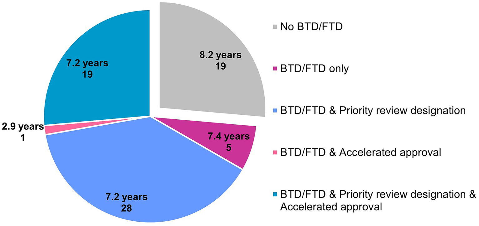 Seventy four % of novel orphan-designated drugs benefited from expedited regulatory programs BTD and/or FTD, and their clinical development time was 7.2 years (n = 53, median). The clinical development time of 26% of the drugs that did not go through BTD or FTD was 8.2 years (n = 19, median), indicating the positive impact of having BTD or FTD in the US on shortening the clinical development time.
