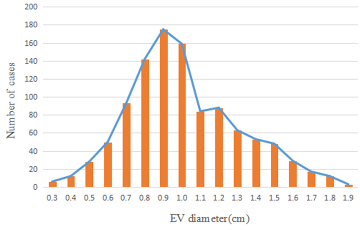Patients included in the present study exhibited an approximate normal distribution, with the majority of cases exhibiting a peak EV diameter of 0.9 cm. The distribution of EV diameters is displayed in Figure 4.