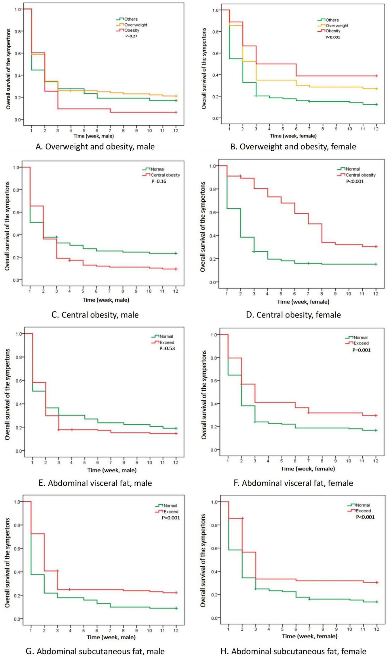 A total of 72 subjects reported the long COVID-19 symptoms. The adjusted Kaplan-Meier analysis and Cox regression analysis revealed a significant correlation with accumulated subcutaneous fat (SFA ≥ 2.0 dm2) and the long COVID-19 symptoms (HR = 2.63, P < 0.001 for male, HR = 1.52, P = 0.048 for female). However, overweight and central obesity showed positive correlation only in women.