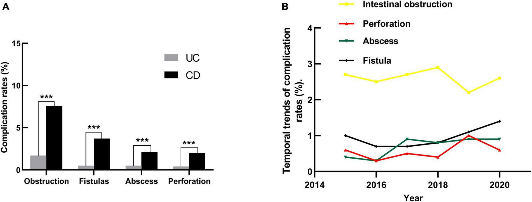 The complications rate in hospitalized patients with IBD in Yunnan province, China, from 2015 to 2020. (A) The complications rate in patients with UC and CD; ***P < 0.001. (B) The rates of intestinal obstruction, perforation, fistula and abscess in patients with IBD in Yunnan Province from 2015 to 2020. Spearman correlation coefficient tests: Intestinal obstruction (r = −0.003, P = 0.708), Perforation (r = 0.015, P = 0.093), Abscess (r = 0.022, P = 0.017), Fistula (r = 0.022, P = 0. 017). Linear by linear association of Mantel-Haenszel chi-square tests results:Intestinal obstruction (X2 = 0.107, P = 0.744), Perforation (X2 = 2.117, P = 0.146), Abscess (X2 = 6.046, P = 0.014), Fistula (X2 = 4.897, P = 0.027).