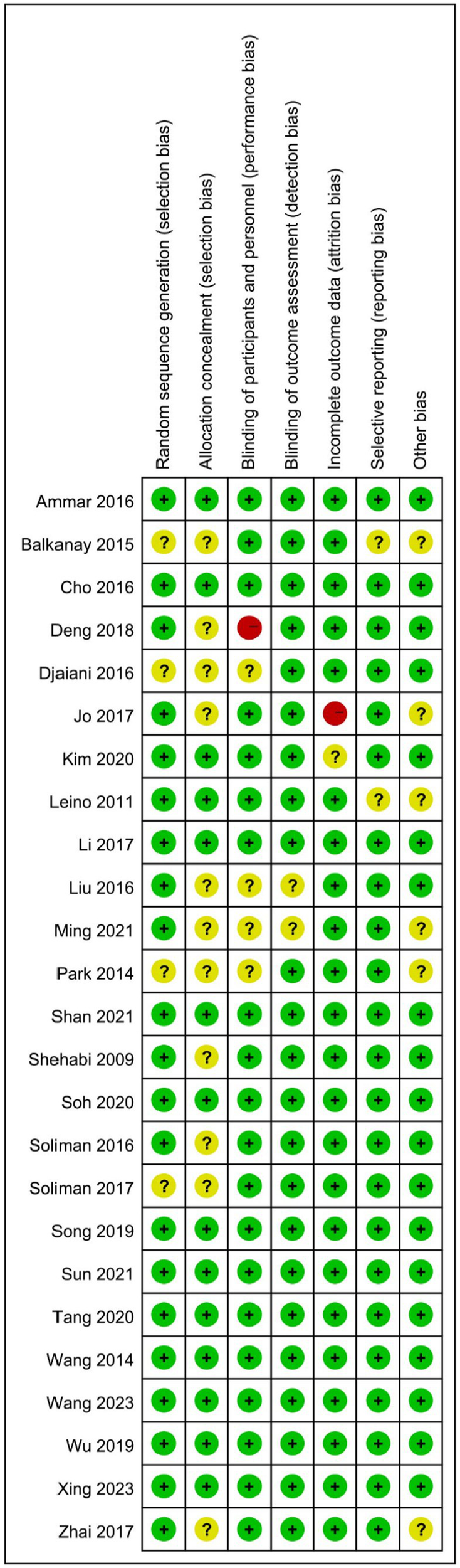 Figure 2 provides an overview of bias risk across the comprised investigations. Four investigations lacked clear reporting of the randomization procedure (15, 17, 20, 25). Eleven trials did not specify whether allocation methods were blinded (13, 15, 17, 20–23, 25–27, 32). Five trials did not adopt double blinding (15, 20, 21, 27, 32). Two studies indicated that the individuals responsible for evaluating the outcomes were aware of the treatment assignments (21, 32). Furthermore, two studies were identified as having a potential risk of missing outcome data (23, 30), and two trials had a risk of selective reporting (14, 17).