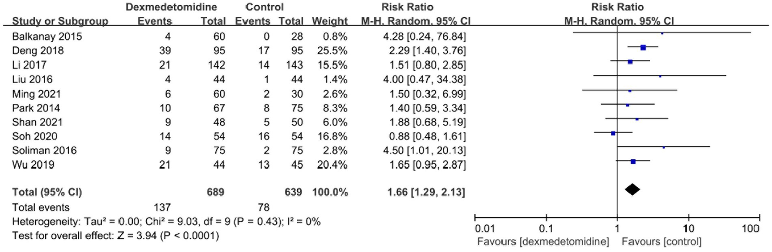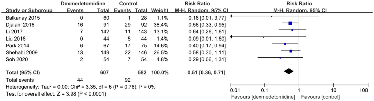 The meta-analysis included 25 trials, including 3,997 individuals. Of these, 2,028 were in the dexmedetomidine group, and 1,969 were in the control group. The result showed that patients administered dexmedetomidine significantly decreased the AKI incidence following surgical operation in contrast to the control group (risk ratio, 0.60; 95% confidence intervals, 0.45–0.78; p < 0.05; I2 = 46%). In addition, dexmedetomidine decreased the period of hospitalization in both the intensive care unit (ICU) and the hospital while also reducing postoperative delirium (POD) occurrence. However, dexmedetomidine elevated the incidence of bradycardia but did not have a significant impact on other indicators.