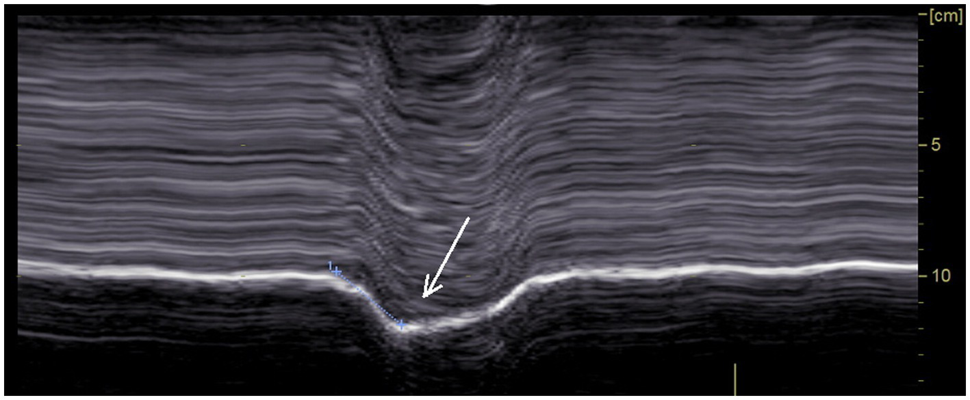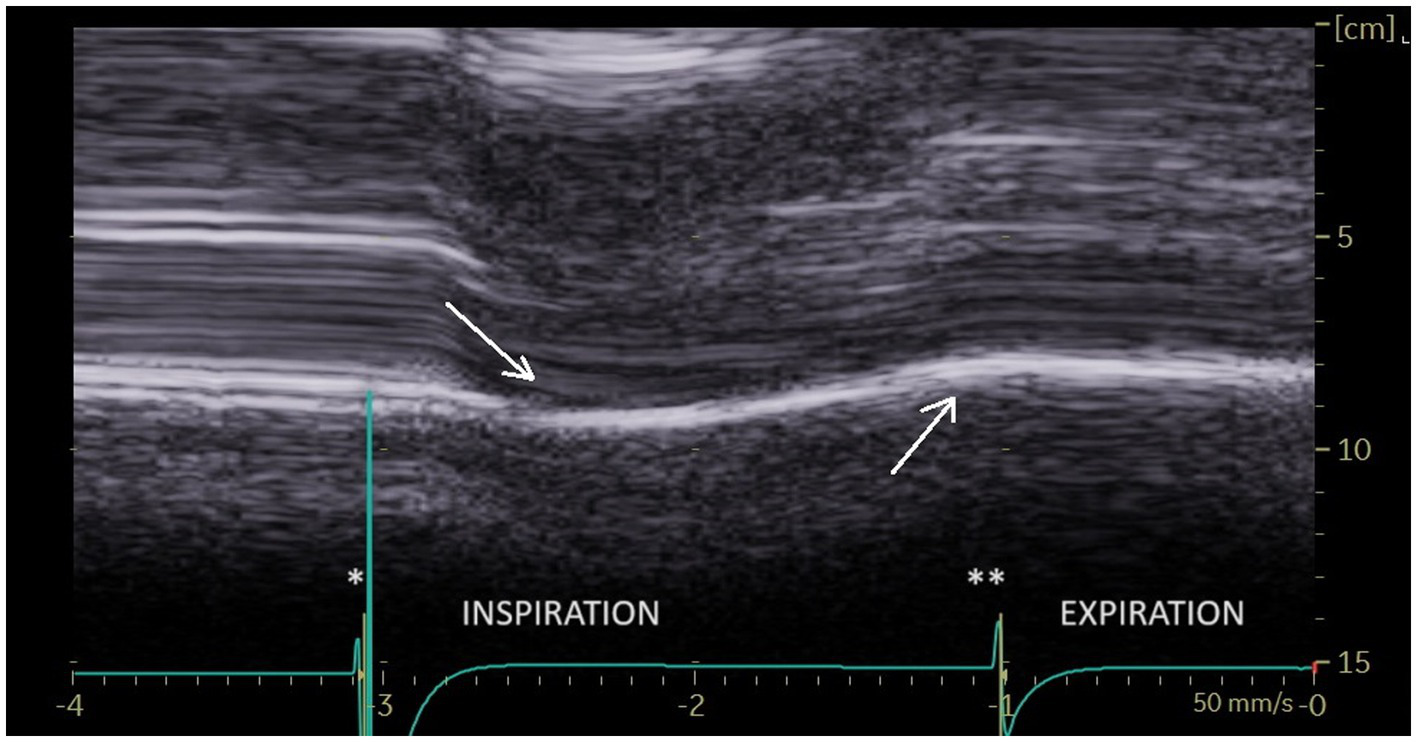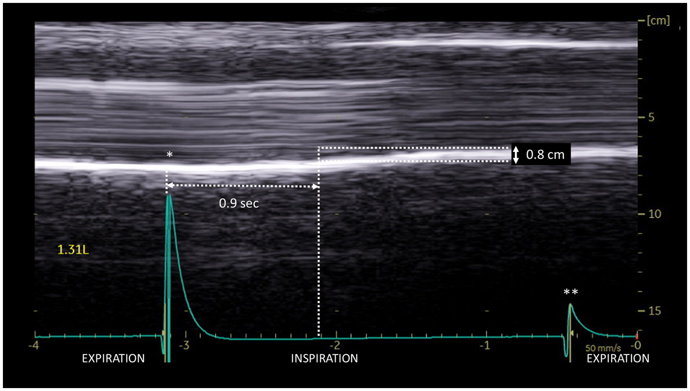 The ultrasonographic examinations were carried out by an experienced investigator (more than 1,000 diaphragm ultrasound examinations performed prior to the beginning of the study). All subjects were investigated in a seated position. The study used a commercially available ultrasound machine (Vivid S60N, GE Medical System, Milwaukee, Wl, United States) connected to a 1.5–3 MHz transducer array (3Sc probe) for excursion measurements and to a linear vascular transducer (9L probe) for thickness measurements. All ultrasound studies had been saved for subsequent blind analysis. To strengthen the accuracy of the results, measurements of ultrasound parameters were averaged from at least three different breathing cycles. To perform measurements at the right time and easily detect paradoxical motions, we used a system developed in our laboratory that can be connected to the ultrasound machine (30). Subjects were breathing through a device that measured inspiratory and expiratory volumes (31). The device incorporated in the turbine support, 3 sensors (1 infrared LED and 2 infrared phototransistors) to detect the changes in the respiratory cycle. Electronic signals corresponding to the beginning of the breathing time, i.e., inspiration and expiration, were sent to the ultrasound screen via ECG cables. To record the beginning of inspiration and expiration, a voltage pulse was sent at the time of the change of direction of rotation of the turbine. The voltage pulse was higher at the beginning of inspiration, which led to a greater amplitude of the signal on the ultrasound screen (see figures).