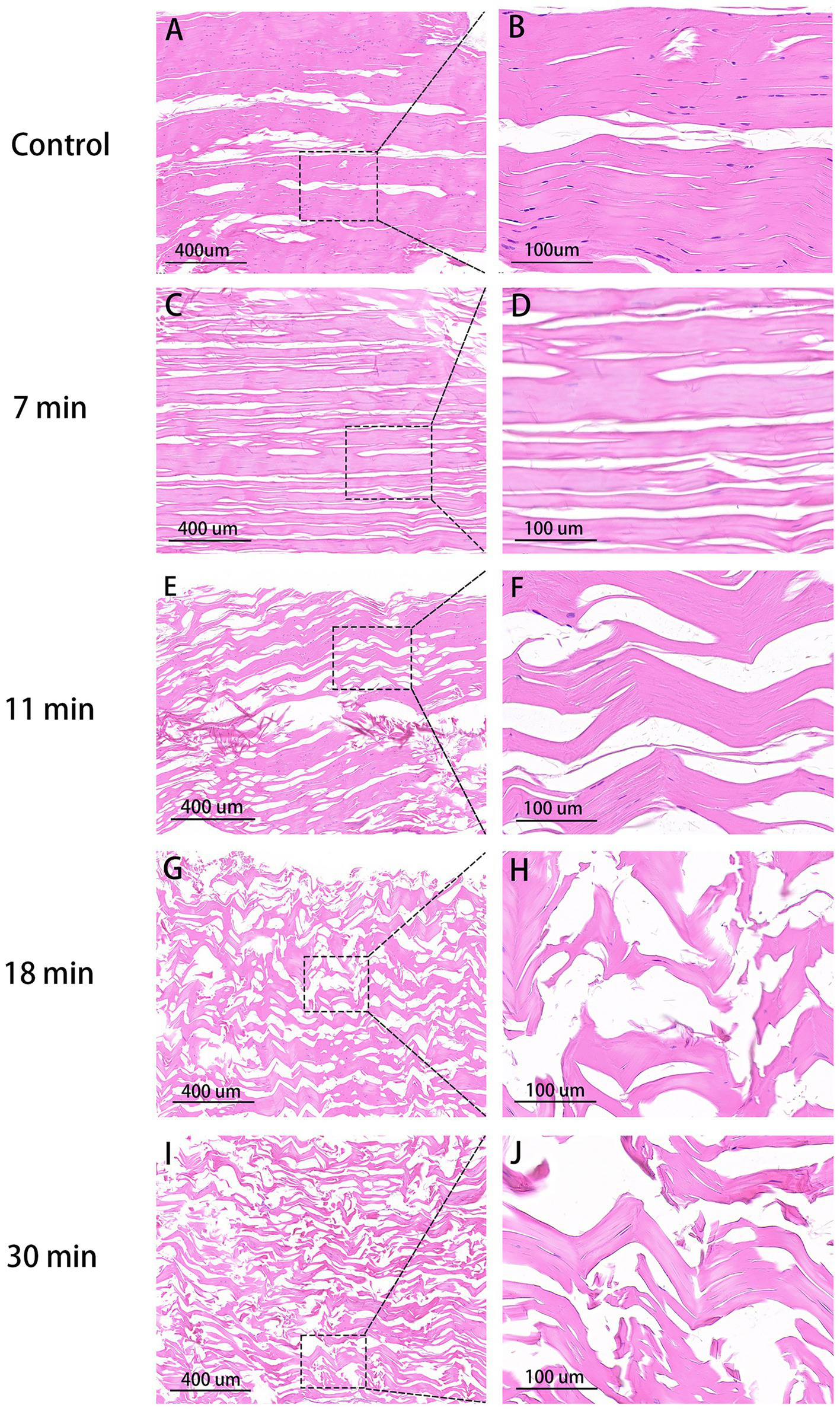 HE stain of tendons (×100, 400). Control group (A,B): Organized collagen fibers, minimal interstitial space, intact nuclei stained purple. 7 min (C,D): Increased interstitial space, aligned collagen, indistinct nuclei. 11 min (E,F): Higher gap, slight fiber fracture. 18 min (G,H): Disordered fibers, larger space, uneven bundle connections, reduced nuclei. 30 min (I,J): Maximal disorder, widest gap, disrupted collagen.