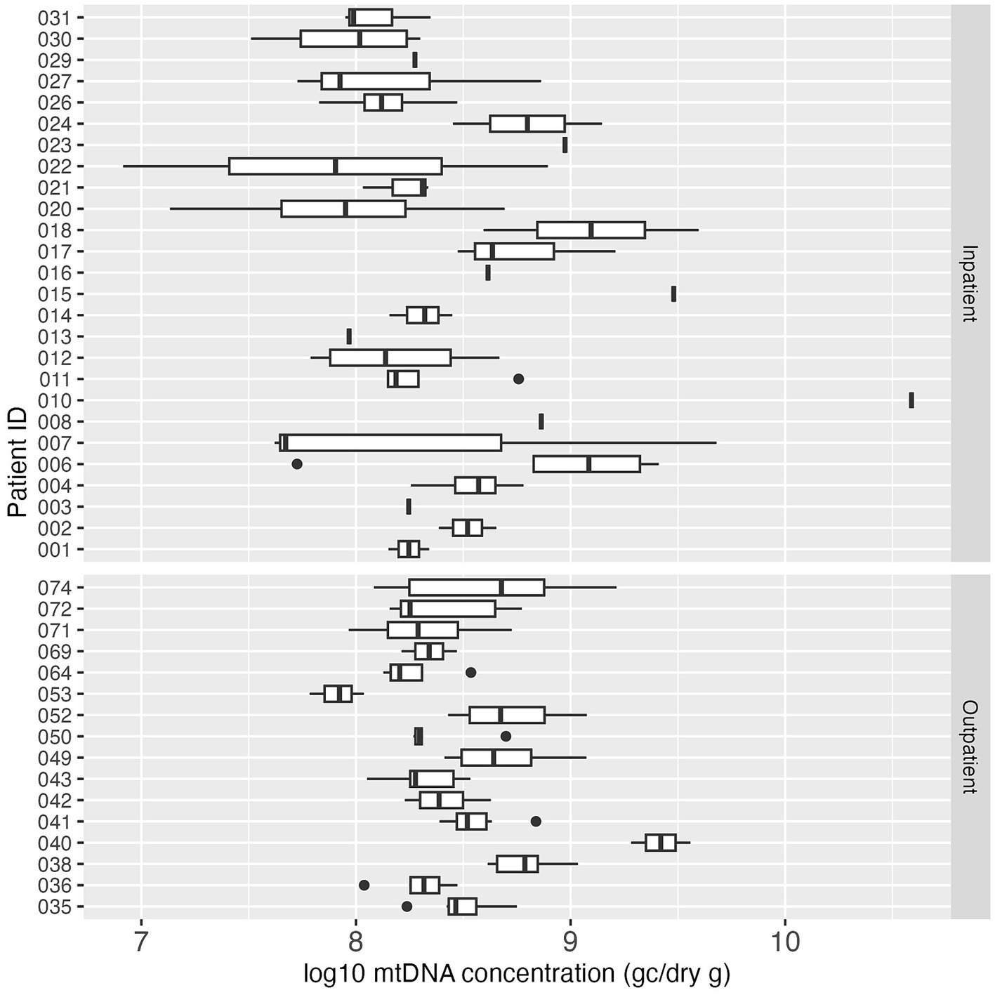 Boxplot of log10-transformed mtDNA concentration (GC/dry gram) in inpatient (top) and outpatient (bottom) study subjects. Each box summarizes the range of mtDNA concentrations in multiple fecal samples from an individual, and the vertical line in the box represents the median mtDNA concentration. The vertical line without the box indicates only one sample was tested for mtDNA for that individual.