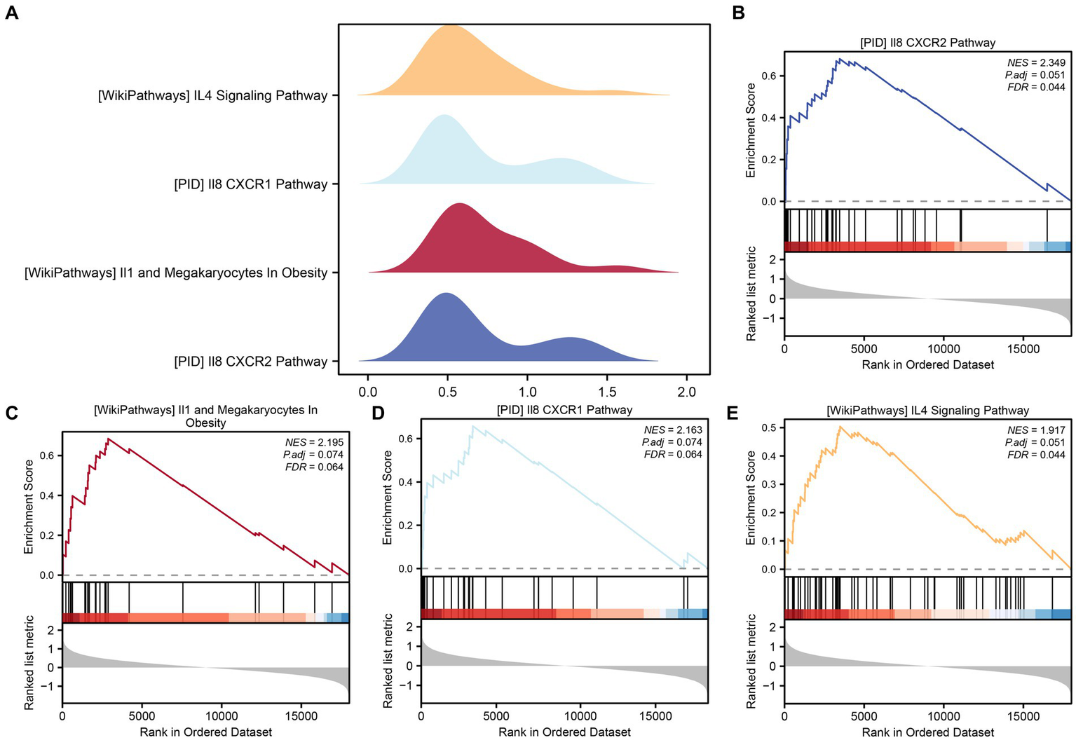 Gene set enrichment analysis (GSEA) assesses the distribution pattern of genes within a predefined gene set in a gene expression dataset sorted by their correlation with phenotypes, aiming to determine their association with the phenotype (61). In this study, genes from the combined datasets were categorized into PCOS and Control. GSEA was performed on all genes in the integrated GEO dataset using the R package clusterProfiler based on their logFC values. The parameters for GSEA included a seed value of 2020, 1,000 permutations, a minimum gene set size of 10, a maximum gene set size of 500, and p-values corrected using the BH method. Gene sets used in GSEA were retrieved from the c2.all.v7.5.1.symbols.gmt gene set in MSigDB. Criteria for significant enrichment were set at p-value <0.05 and FDR < 0.25.