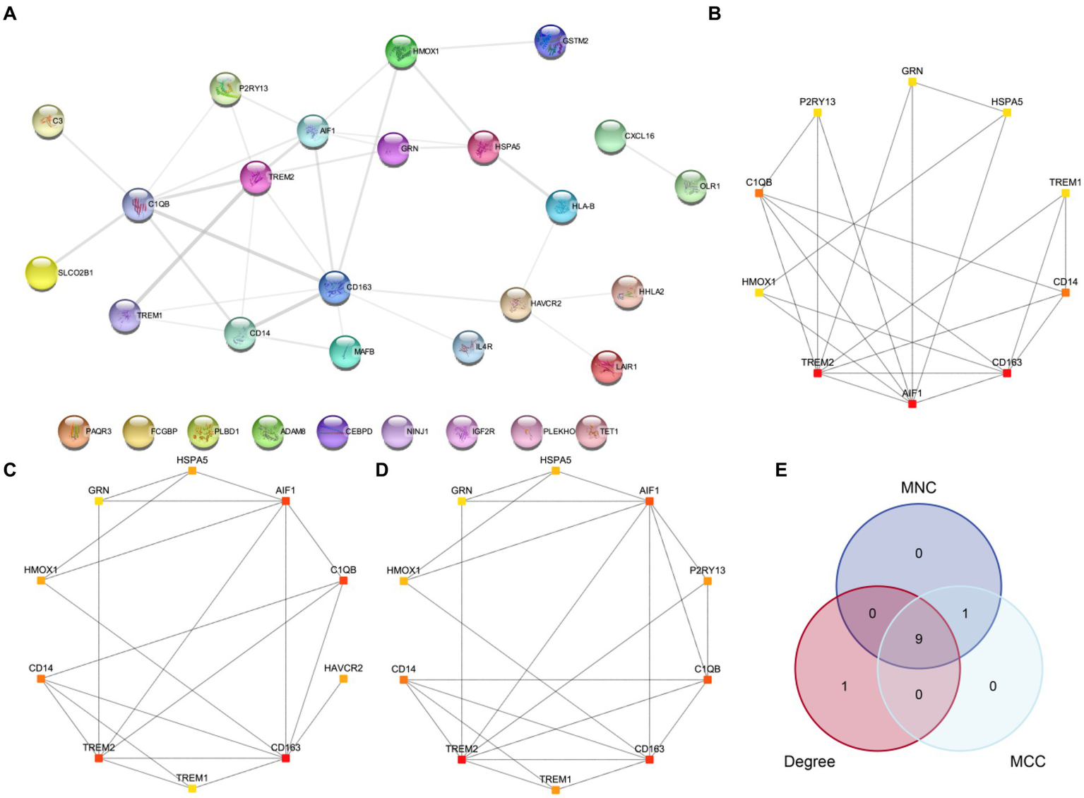 In addition, the top 10 hub genes related to macrophage polarization were identified using three algorithms within the cytoHubba plugin (65): Maximum Neighborhood Component (MNC), Degree, and Maximal Clique Centrality (MCC) (66). First, scores for MPRDEGs in the PPI network were computed and ranked. Subsequently, the intersection of the top 10 genes from each algorithm was determined, and a Venn diagram was generated to analyze the overlap. Genes appearing in all three algorithm results were considered hub genes associated with macrophage polarization.