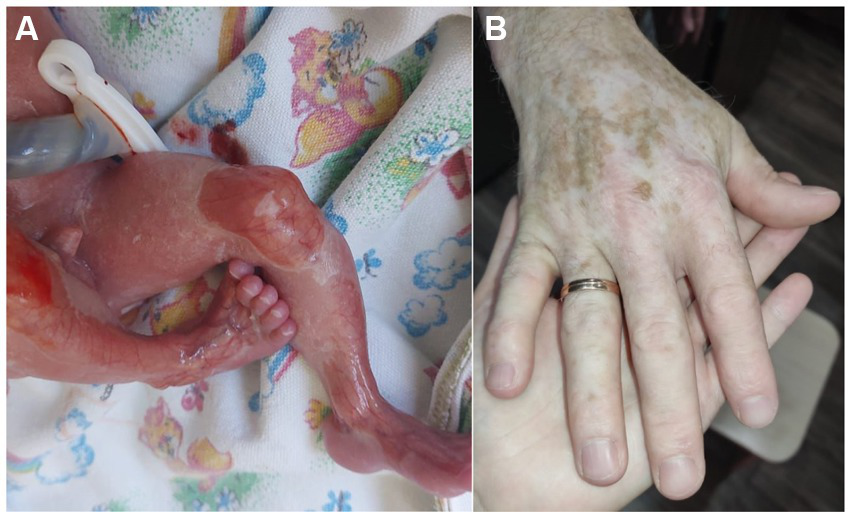 Family 3 includes 2 patients—the son born in 2021 and the father born in 1992. The proband is a boy from the first pregnancy, which occurred against the background of gestosis. It was the first birth, delivered by an unexpected cesarean section in the 27th week of gestation. He had aplasia cutis on the legs, dorsum of the foot, and hands and a blister in the armpit (Figure 3A). During the course of treatment in the intensive care unit, large blisters and erosions developed due to the skin trauma associated with the treatment measures. The child was discharged home at the age of 4.5 months, at which time the areas of aplasia cutis were epithelialized, with rare blisters on the oral mucosa. He also had atrophic scars, milia, and areas of hypopigmentation. Up to the age of 6 months, he had areas of follicular atrophoderma on the legs, and his nails were normal.