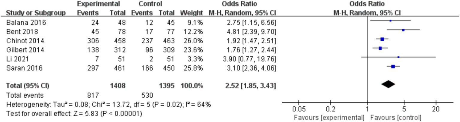 In the 8 included studies, 2 trials reported CR as the primary efficacy measure, and 7 trials reported PFS and OS as the primary efficacy measure. Meta-analysis of the fixed-effect model showed that PFS was significantly longer in the experimental group than in the control group [HR = 0.64, 95%CI (0.60, 0.68), p < 0.0001, Figure 4], and that CR was significantly increased in the experimental group than in the control group [OR = 3.78, 95%CI (2.00, 7.15), p < 0.0001, Figure 5]. Random-effect model showed that OS was significantly longer in the experimental group than in the control group [HR = 0.64, 95%CI (0.60, 0.68), p < 0.0001, Figure 6]. The results of the study demonstrated that the combination of BEV and TMZ was more effective than TMZ alone.