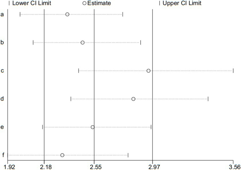 Adverse event is the second outcome, and was used for the sensitivity analysis. Sensitivity analysis was assessed by the leave-one-out method, the results presented that pooled effect changed after removing the included articles one by one (shown in Figure 9).