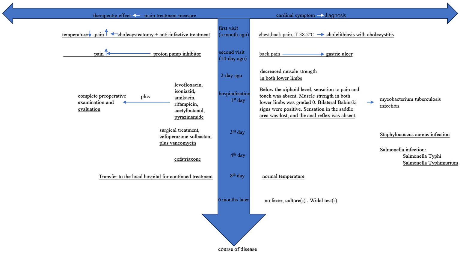 On the fourth day of admission, 65 reads were identified as Salmonella enterica serovar Typhimurium and 19 reads were identified as Salmonella enterica serovar Typhi, and this result was also supported by the polymerase chain reaction (PCR) verification. Based on the results of domestic epidemiological investigations, the anti-infection treatment plan was adjusted to ceftriaxone (1). The patient’s temperature and inflammatory markers showed a trend of improvement, and she was subsequently transferred to a local hospital for continued treatment. Approximately 6 months later, follow-up revealed no fever, and stool culture and agglutination tests were negative, and no clinical sign of recurrence was observed in the spine (Figure 2).