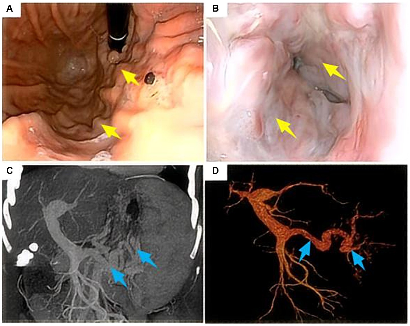 Gastroduodenoscopy and computed tomography scan of the upper abdomen in a 47-year-old female patient who had been vomiting blood repeatedly for 6 years before admission. (A,B) Gastroduodenoscopy suggests severe varices of the esophageal and fundal veins (yellow arrows); (C,D) CT scan of the upper abdomen suggests cirrhosis, splenomegaly, and portal hypertension (widening of the main portal vein and varicose splenic veins) (blue arrows).