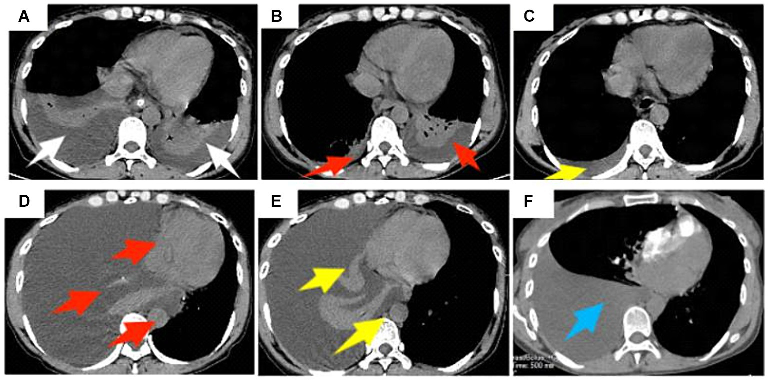 A 47-year-old female patient underwent obot-assisted laparoscopic splenectomy combined with pericardial devascularization (LSPD). (A) Chest CT 4 days after LSPD showed bilateral pleural effusions and most of the lower lobes of both lungs were atelectatic (white arrows); (B) percutaneous percutaneous drainage of the right pleural effusion was performed, and a follow-up CT 8 days after the operation showed a decrease in the bilateral pleural effusions (red arrows); (C) Chest CT 47 days after the operation showed a small amount of effusion in the right pleural cavity (yellow arrow); (D) The mediastinal window of the chest CT on day 116 postoperatively showed a large right pleural effusion, complete atelectasis of the right lung, and left shift of the trachea, heart, and mediastinum (red arrow); (E) the patient underwent percutaneous right pleural effusion puncture and drainage, and chest CT on day 129 postoperatively still showed a large right pleural effusion (yellow arrow); (F) chest CT on day 137 postoperatively showed a large right pleural effusion but less than before (blue arrow).