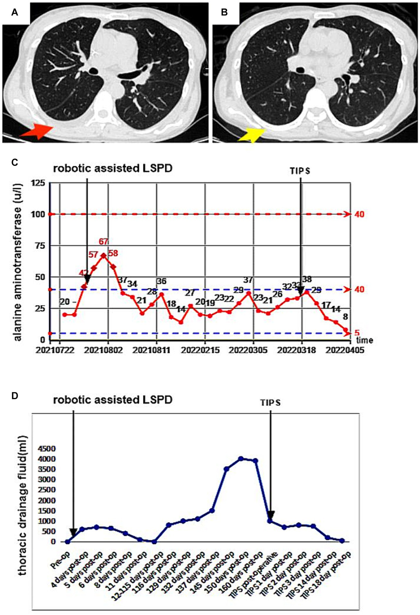 A 47-year-old female patient underwent robotic assisted LSPD, TIPS treatment was performed 169 days after LSPD surgery. (A) On the 4th day after TIPS surgery, a chest CT scan (chest window) showed a small amount of pleural effusion on the right side, which was significantly improved compared to before (red arrow); (B) 14 days after TIPS surgery, chest CT showed no obvious effusion in the right chest cavity and good lung expansion (yellow arrow); (C,D) The patient’s serum alanine aminotransferase (ALT) level and chest drainage fluid decreased significantly after TIPS.