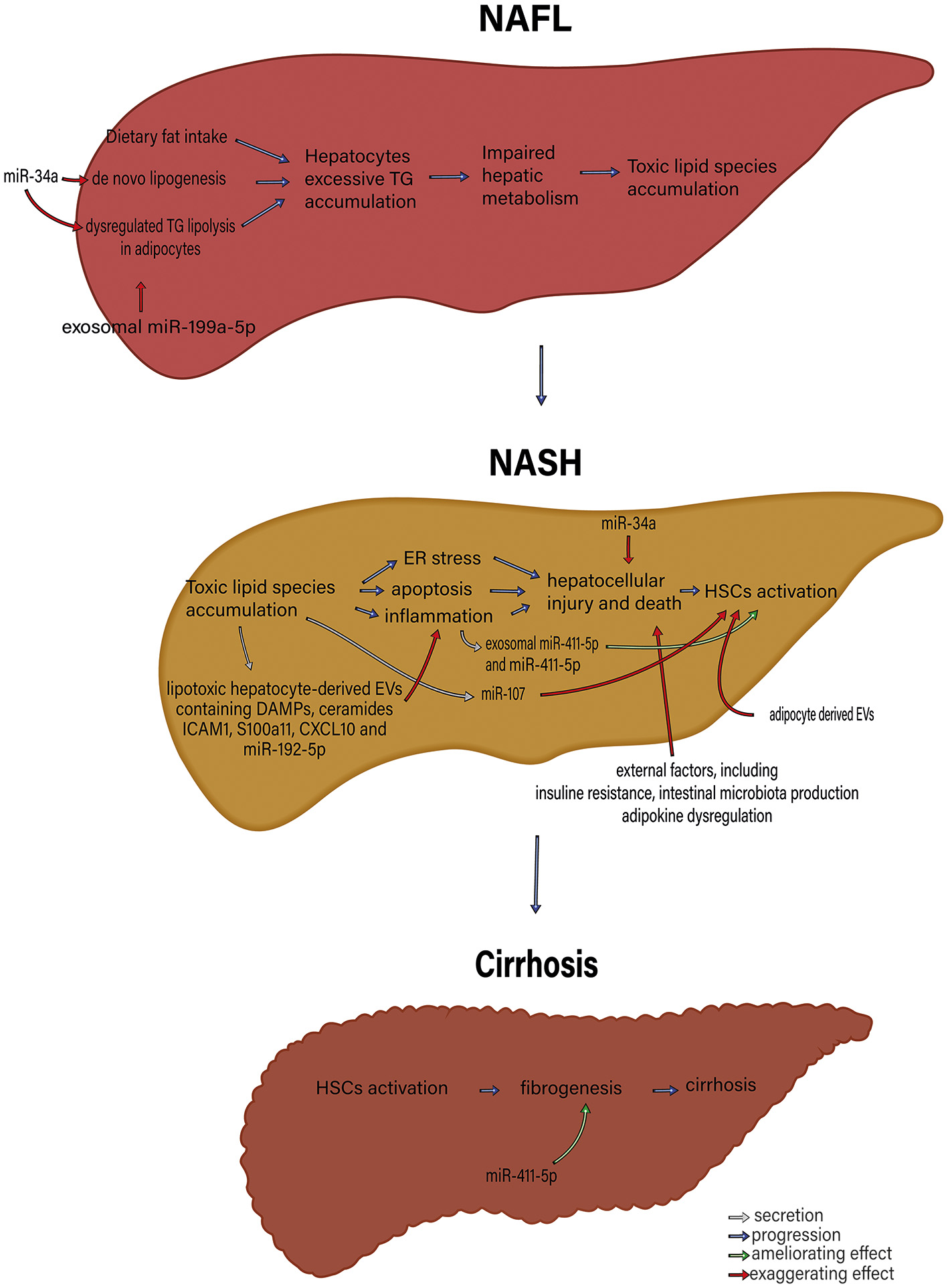 The roles of exosome and exosomal miRNAs in NAFLD pathophysiology. microRNAs, including miR-34a and exosomal miR-199a-5p, that control de novo lipogenesis and dysregulated TG lipolysis in adipocytes significantly induce excessive hepatocyte TG accumulation. Subsequently, TG accumulation in hepatocytes gives rise to impaired hepatic metabolism and toxic lipid species accumulation. The accumulation of toxic lipid species leads to ER stress, apoptosis, and inflammation. These changes contribute to hepatocellular injury and death, followed by HSC activation. MiR-34a, exosomal miR-411-5p and miR-411-5p, miR-17, adipocyte-derived EV, lipotoxic hepatocyte-derived EVs containing DAMPs, ceramides, ICAM1, S100a11, CXCL10 and miR-195-5p and external factors including insulin resistance, intestinal microbiota production, and adipokine dysregulation participate in various parts of this process. HSC activation results in fibrosis and, eventually, cirrhosis. miR, microRNA; TG, triglyceride; ER, endoplasmic reticulum; DAMPs, Damage-associated molecular patterns; ICAM-1, Intercellular Adhesion Molecule 1; HSCs, Hepatic stellate cells; EVs, extracellular vesicles.