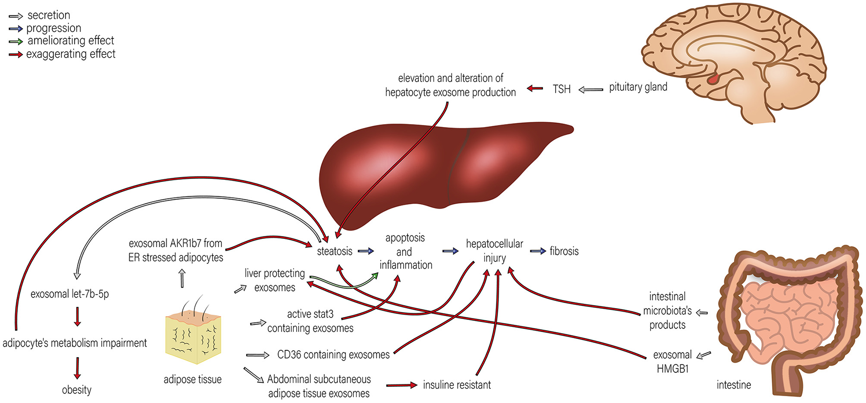 The roles of exosomes in the interactions of the liver and pituitary gland, intestine, and adipose tissue in NAFLD. Different organs are involved in the development of NAFLD, and their interactions with the liver play significant roles in NAFLD progression. By TSH regulation, the pituitary gland alters hepatocyte exosome production, which exaggerates steatosis. TSH stimulation of HepG2 cells leads to exosome release and upregulation of proteins involved in steatosis. Adipose tissue induces progression in various steps of NAFLD, including steatosis, apoptosis, inflammation, and hepatocellular injury by exosomal AKR1B7 released from ER stressed adipocytes, active stat3 containing exosome, CD36 containing exosomes and insulin resistance caused by abdominal subcutaneous adipose tissue exosomes. Therefore, adipocytes' metabolism impairment promotes steatosis. Moreover, steatosis can also exaggerate the metabolism impairment of adipocytes through exosomal let-7b-5p. On the other hand, liver-protecting exosomes originating from adipose tissue can ameliorate apoptosis and inflammation. The intestine can also affect NAFLD development in two ways: (1) intestinal microbiota products can amplify hepatocellular injury, and (2) exosomal HMGB1 increases steatosis.