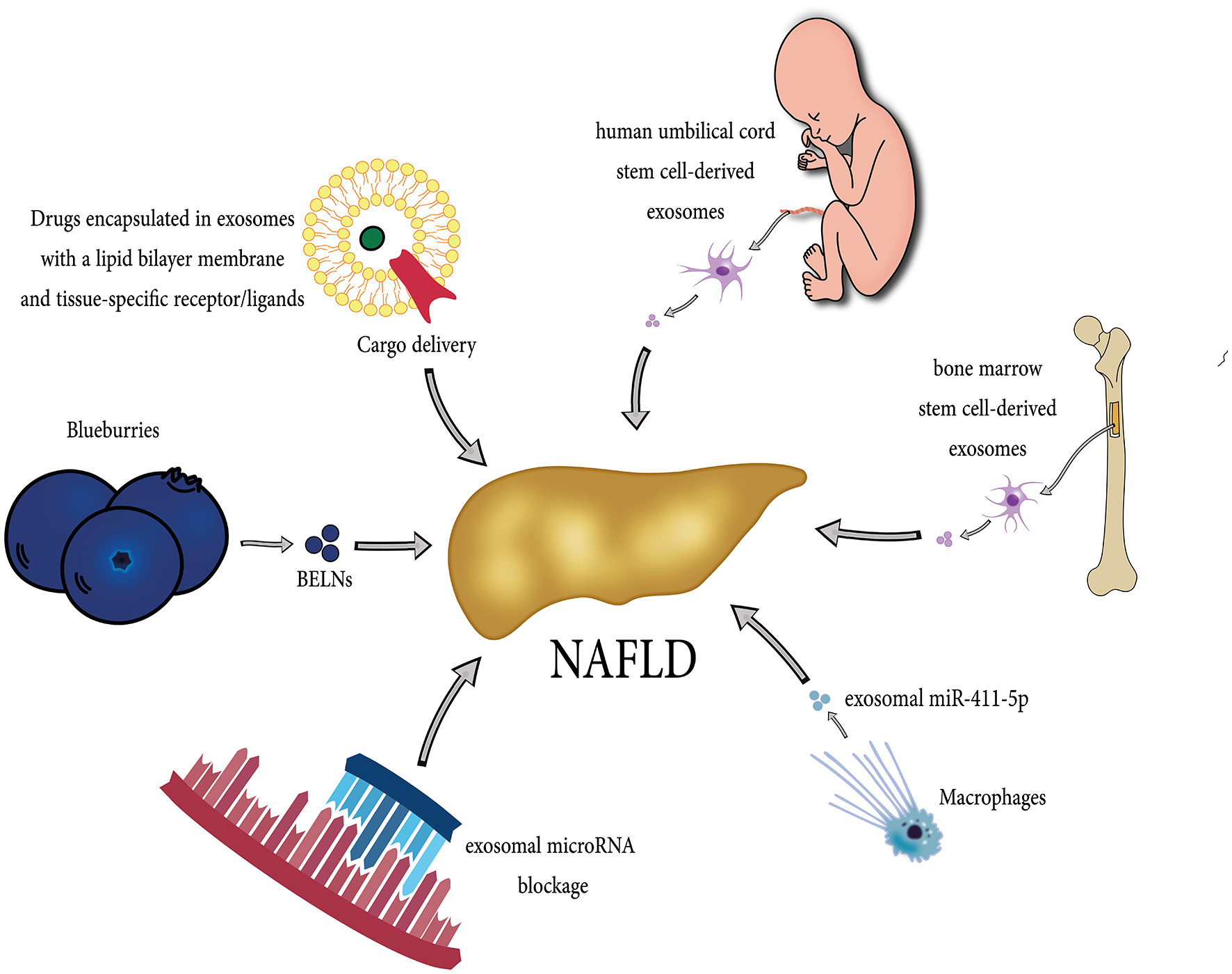 Diverse potential exosome-based therapeutic strategies in NAFLD. Exosomes originating from different sources, including stem cells, bone marrow, macrophages, and Blueberries, can exert beneficial effects in the treatment of NAFLD. Each source contributes unique therapeutic properties, such as anti-inflammatory and regenerative capabilities, immune modulation, and fibrosis inhibition, making them a promising tool in NAFLD management. They can be administered safely in high doses due to their cell-free nature, exhibit low toxicity, remain stable during circulation, and have minimal immunogenicity. Moreover, researchers are actively exploring exosome-based therapies for NAFLD, including drug delivery (serving exosomes as drug carriers, delivering therapeutic cargo directly to liver cells), targeted approaches (blocking exosomal contents such as microRNAs), and modulation of inflammatory processes.