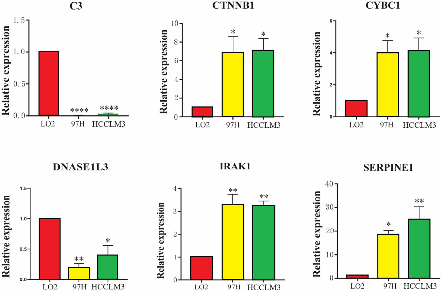 As shown in Figure 5, the expression differences of the six Hub genes C3, CTNNB1, CYBC1, DNASE1L3, IRAK1, and SERPINE1 between human liver cancer cell lines and normal liver cell lines are statistically significant. C3 and DNASE1L3 are significantly different in HCCLM3 and 97H liver cancer cells. The cell lines showed relatively low expression compared with normal liver cells, while CTNNB1, CYBC1, IRAK1, and SERPINE1 showed relatively high expression in HCCLM3 and 97H liver cancer cell lines compared with normal liver cells.