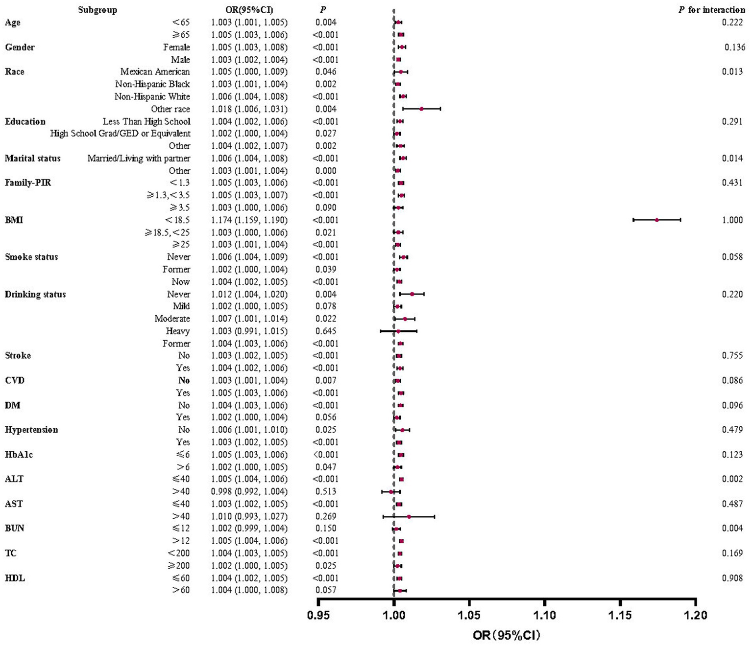 | ALT(U/L) | 23.977 (23.535,24.419) | 26.672 (26.169,27.174) | 28.101 (27.347,28.856) | 27.337 (25.990,28.685) | <0.001 |