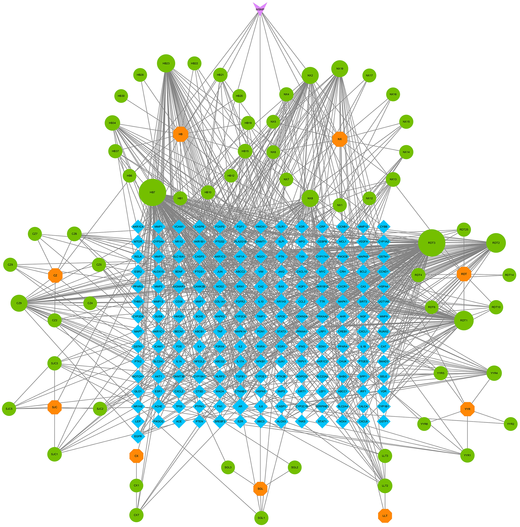 Chinese herbal compound–drug–active component–common target network. Among them, the purple inverted triangle represents the Modified Simiao Powder (MSMP), the orange hexagon represents the Traditional Chinese medicine, the green circle represents the active ingredient, and the blue rectangle represents the target. The figure size indicates the Degree value.