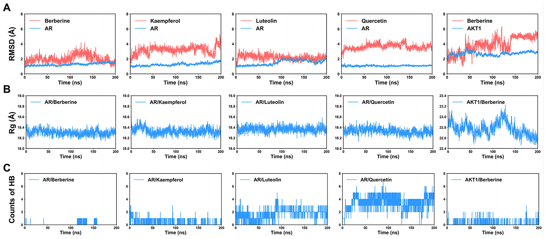 These findings imply that the therapeutic effects of MSMP was potentially mediated by targeting several pivotal genes, such as androgen receptor (AR), NFKB1, AKT1, MAPK1, and CASP3, and regulating some pathways, including lipid metabolism and atherosclerosis, the AGE–RAGE signaling pathway in diabetic complications, the PI3K–Akt signaling pathway, fluid shear stress, atherosclerosis, and Kaposi's sarcoma-associated herpesvirus infection. Molecular docking assessments demonstrated that these compounds of MSMP, such as berberine, kaempferol, quercetin, and luteolin, exhibit high binding anities to AR and AKT1. Molecular dynamics simulations validated the interactions between these compounds and targets.