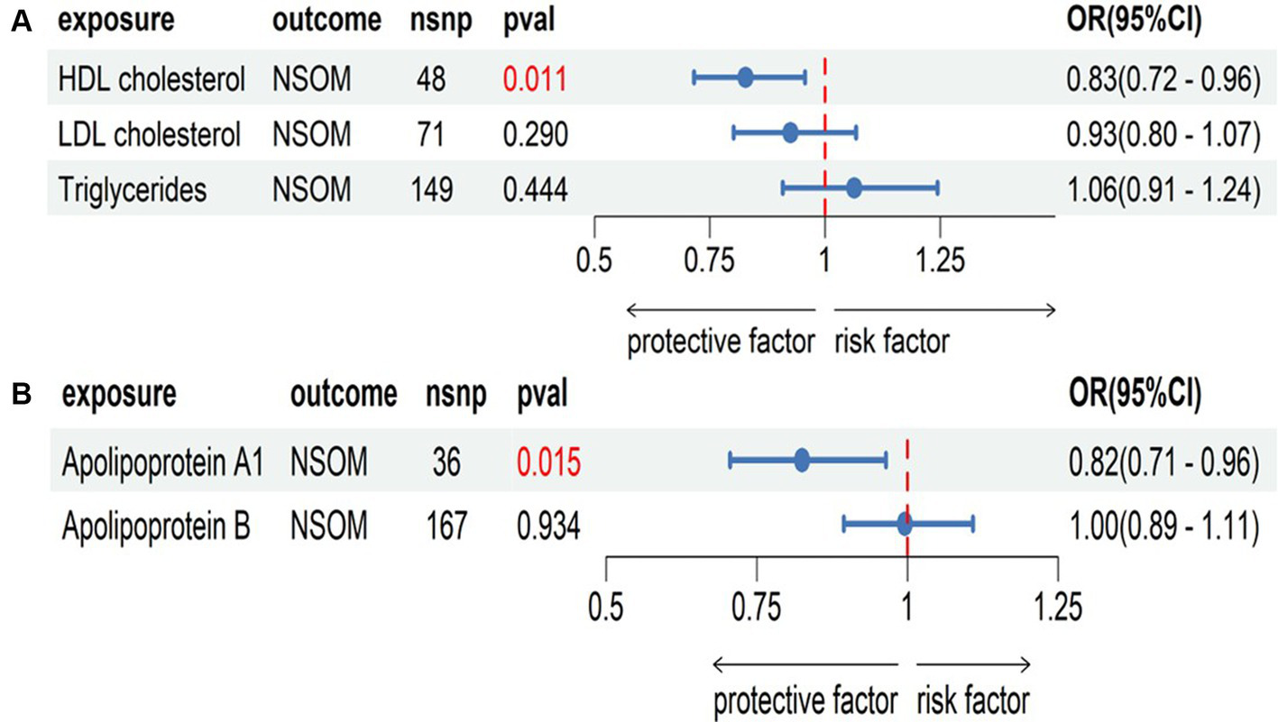 Multivariate Mendelian randomization analysis, (A) the group of HDL cholesterol, LDL cholesterol, and triglycerides; (B) the group of apolipoprotein Al and apolipoprotein B. The red text denotes that the p-value for this trait is less than 0.05. nsnp, the number of single nucleotide polymorphisms used as instrumental variables for NSOM, non-suppurative otitis media.