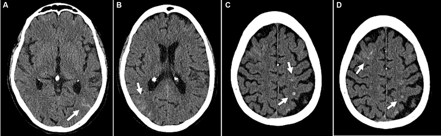 Example of cerebrovascular complications (patient 47): Disseminated small subarachnoid hemorrhages (A,B). Small intracranial hemorrhages in the left parietal and right frontal lobes with adjacent edema (C,D). (A–D) Transversal CT images.