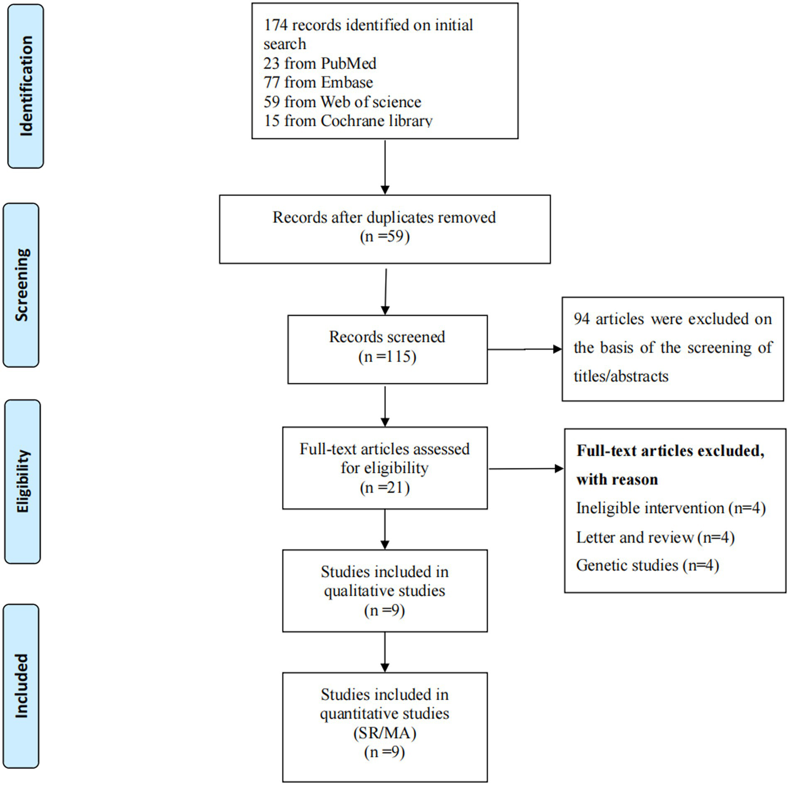 174 articles were obtained by searching four databases, among which, 59 duplicates were deleted after importing into NoteExpress. Subsequently, 94 were removed based on title and abstract, and 21 relevant research papers were screening out. 12 papers were dropped after reading the full text based on our predetermined inclusion and exclusion criteria. Up to October 24th 2023, 9 papers were finally included. The detailed flow chart is shown in Figure 2 and the reasons for exclusion are given in Appendix.