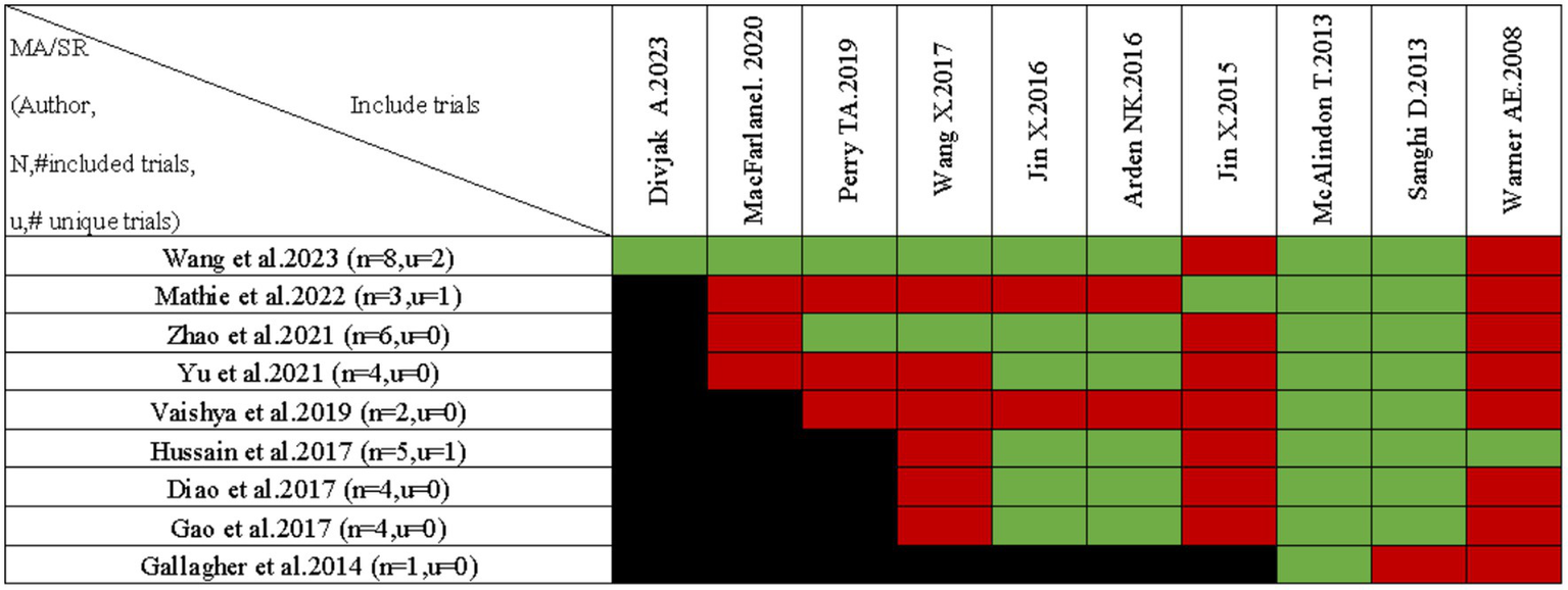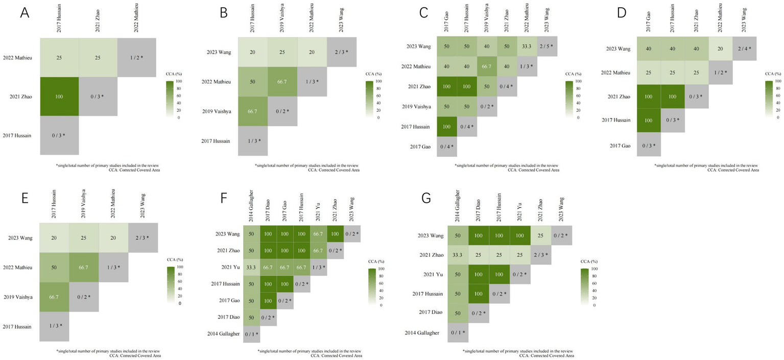 The CCA percentage is calculated as N-r / r*c-r, where N is the total count of publications, r is the number of primary publications, and c is the number of reviews. CCA values of 0–5% represent “slight overlap,” 6–10% signify “moderate overlap,”11–15% denote “high overlap” and values above 15% indicate “very high overlap” (15). CCA index can be used to assess overlap between primary studies in different systematic reviews. The systematic reviews are arranged in ascending order based on their publication dates. As requested, the gray diagonal tiles represent the number of individual/total primary studies included in each review. For each outcome, apart from the joint national assessment at the outcome level, we have also created a citation matrix to address the issue of overlap.