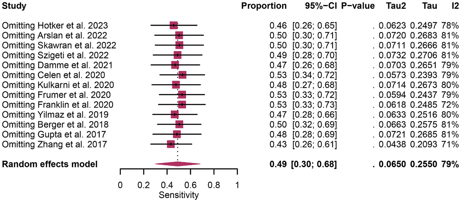 In terms of heterogeneity, the I2 values for the pooled overall sensitivity were 84% for 68Ga-PSMA-11 PET and 79% for mpMRI, highlighting substantial heterogeneity (Figure 3). Despite this, meta-regression and sensitivity analysis did not identify any potential sources of heterogeneity, as illustrated in Figures 4, 5 and Table 3. Notably, the results from the sensitivity analysis remained stable, with only minor variations observed (ranging from 0.66 to 0.78 for 68Ga-PSMA-11 PET and from 0.43 to 0.53 for mpMRI), as shown in Figures 4, 5.